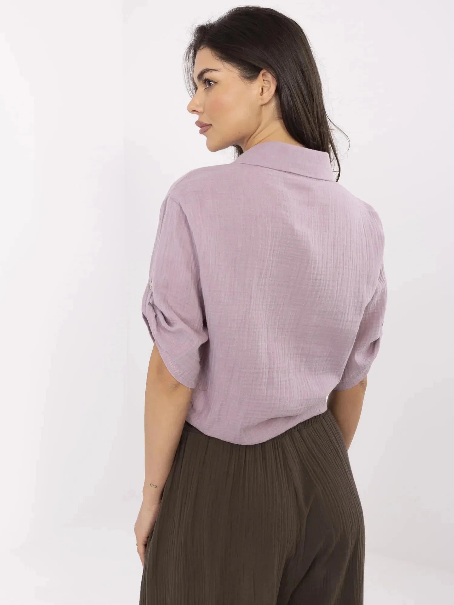 Wymiary koszuli w rozmiarze one size mierzone na płasko: szerokość pod pachami - 54 cm, długość rękawa - 29 (od szwu), długość całkowita - 58 cm, szerokość w biodrach - 48 cm.