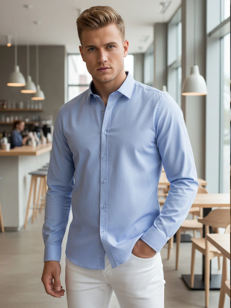 Elegancka koszula męska o dopasowanym kroju, która podkreśla sylwetkę i nadaje stylizacji nowoczesnego charakteru. Gładka, przyjemna w dotyku tkanina z dodatkiem elastanu zapewnia komfort noszenia oraz swobodę ruchów. Model idealnie sprawdzi się zarówno w stylizacjach biznesowych, jak i wieczorowych.