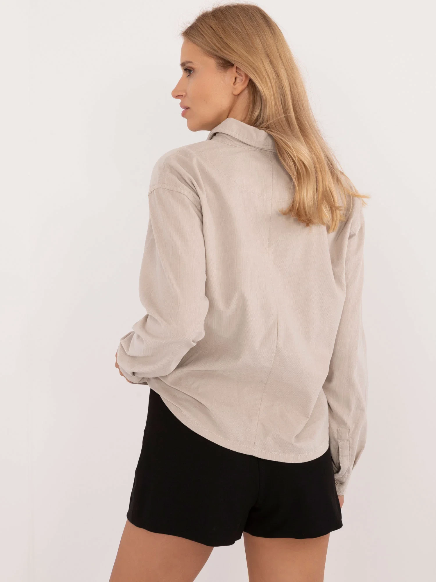 Wymiary koszuli w rozmiarze S mierzone na płasko: szerokość pod pachami - 57 cm, długość rękawa - 63 cm, długość całkowita - 56 cm.