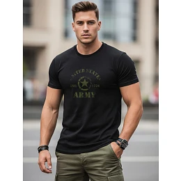 T-shirt męski NX087R wyróżnia się nadrukiem o militarnej tematyce z napisem „United States Army” oraz „EST. 1776”. Centralny motyw gwiazdy nadaje całości surowy, wojskowy charakter. Delikatnie postarzana grafika wpisuje się w styl casualowy i streetwearowy. Klasyczny fason sprawia, że koszulka dobrze komponuje się z codziennymi stylizacjami.