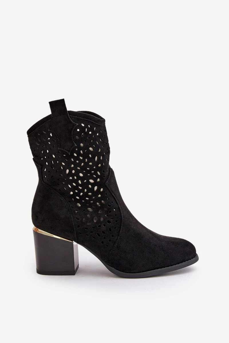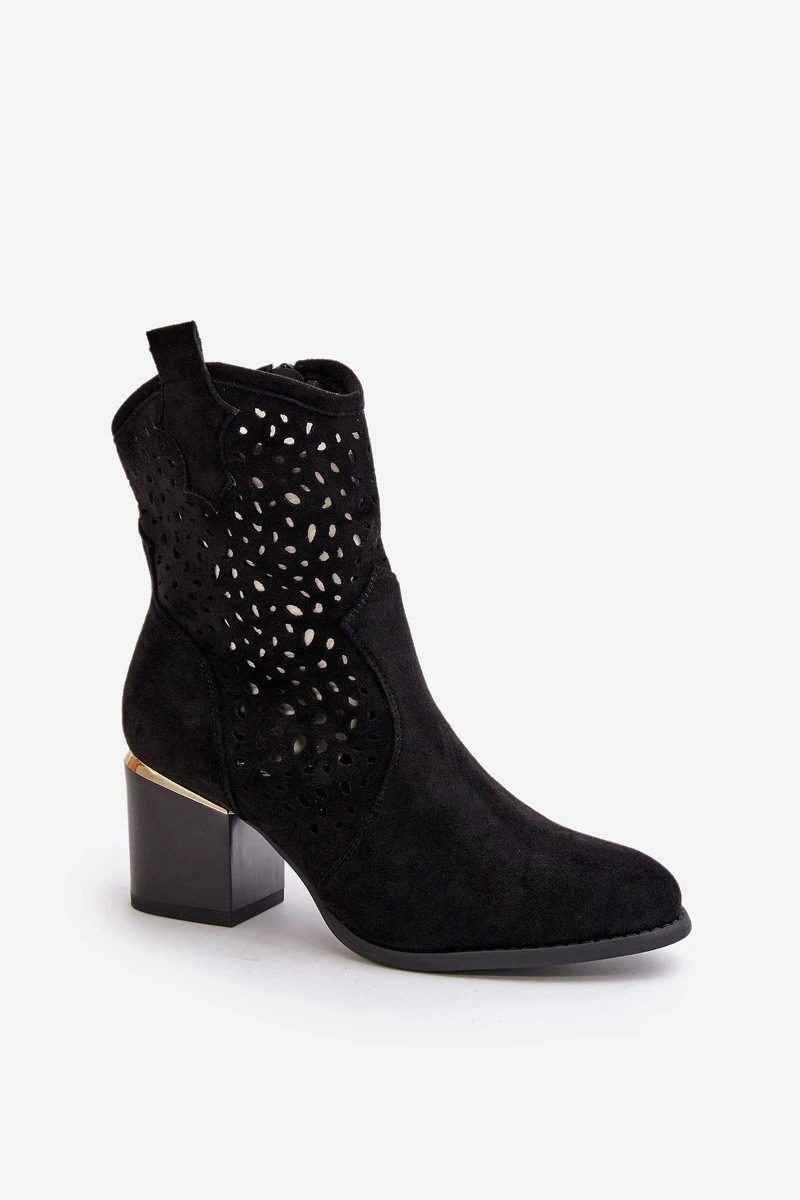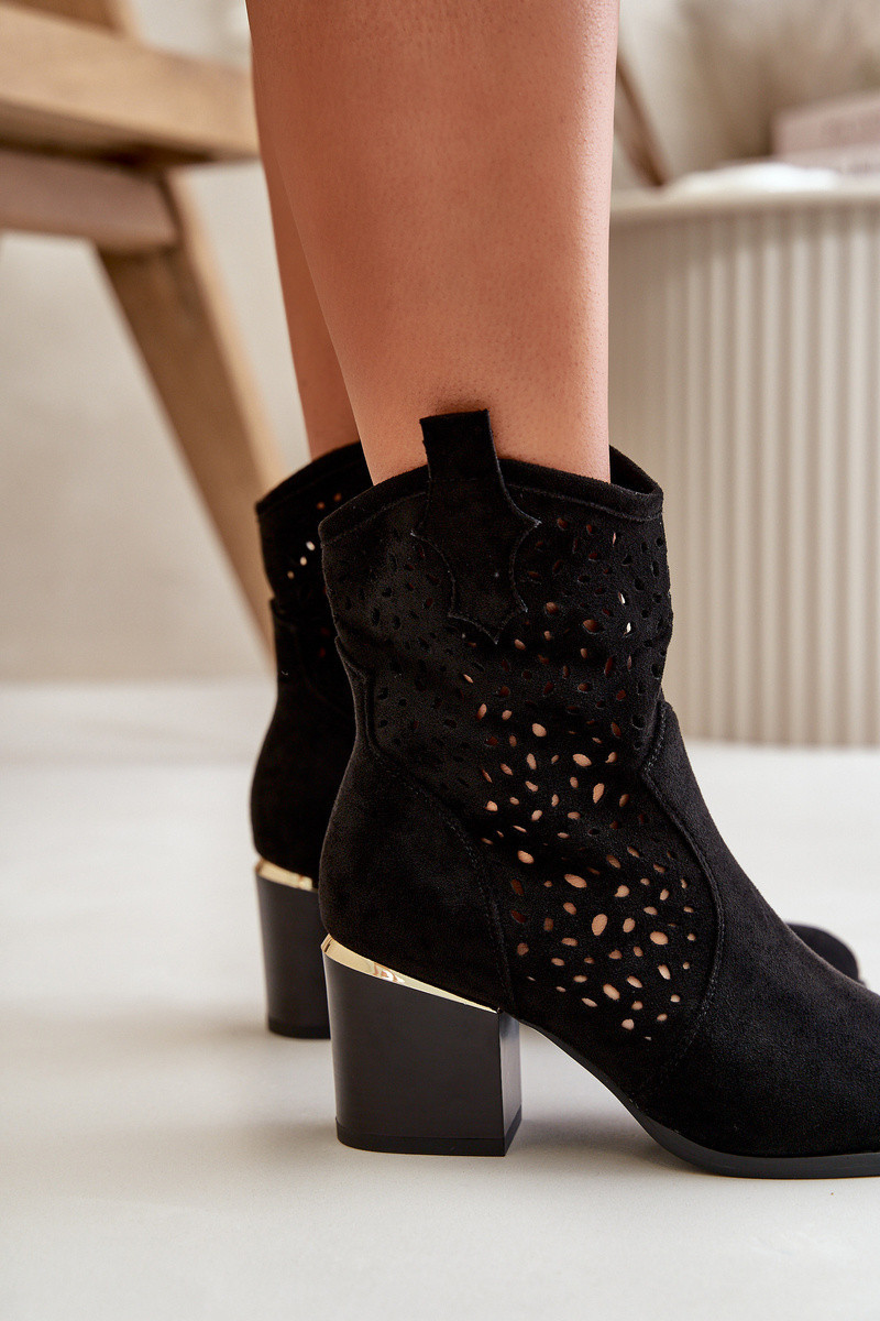 Dámské botky vyrobené z ekologického semiše, vynikají ažurovou štíhlou částí, která sahá až za kotník. Umístěné na elegantní sloupkovém podpatku, zdobeném zlatým prvkem, což jim dodává výjimečný charakter. Zapínají se na zip, což zajišťuje pohodlí při nošení. Špičky jsou zaoblené, což podtrhuje jejich klasický a stylový vzhled. Ideální pro každodenní i elegantní styly. Při výběru velikosti se řiďte tabulkou velikostí.