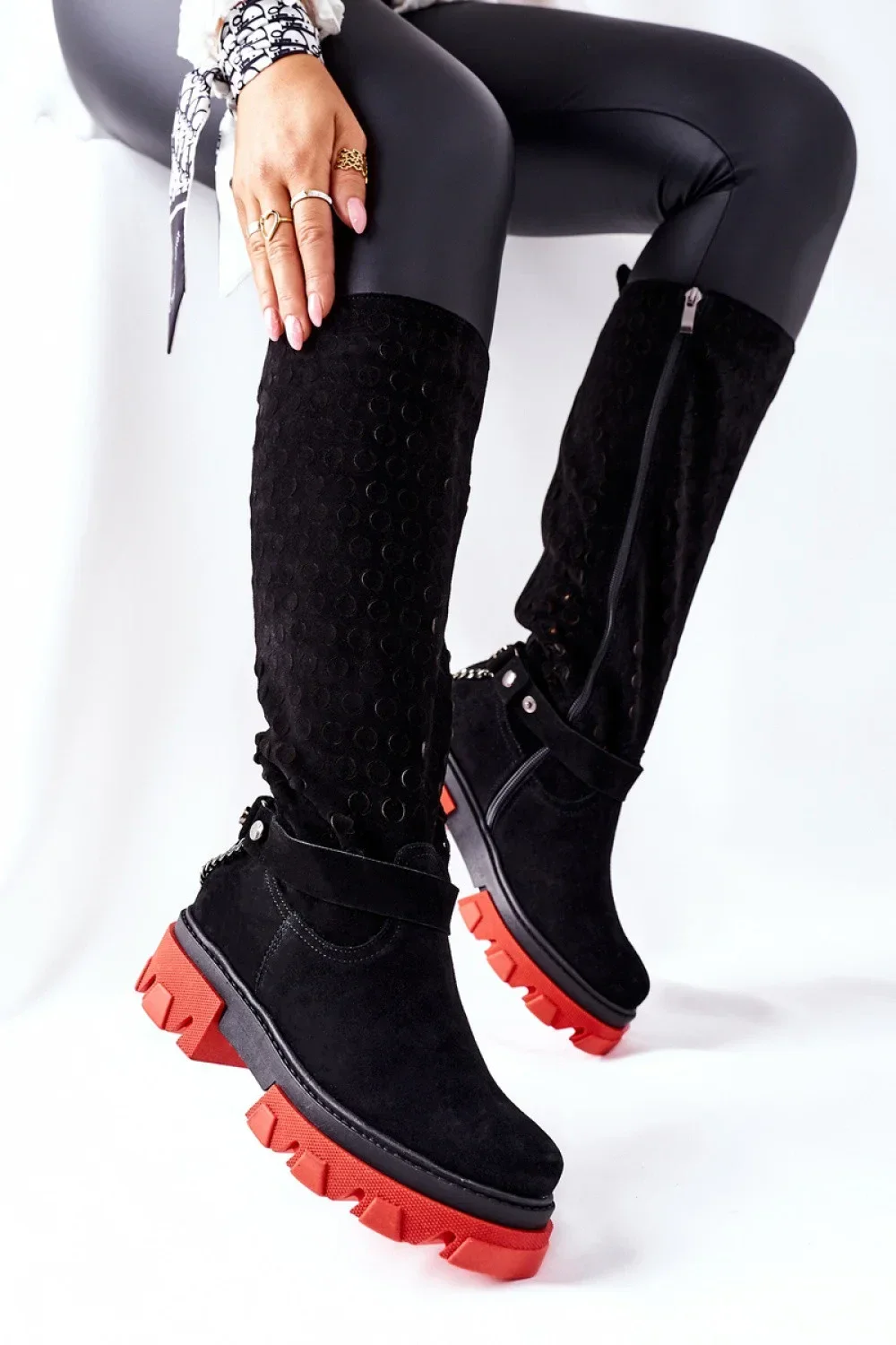 Úžasné kozačky, které nesmí chybět v šatníku tak výjimečné ženy, jako jste vy! Silná podrážka na platformě, řetízkové ozdoby a pásek s nýty jsou to, co podtrhuje jejich úžasný, silný charakter! Odnímatelná ozdoba. Boty jsou vyrobeny výhradně z přírodního semiše. Zip na boku usnadňuje jejich oblékání.