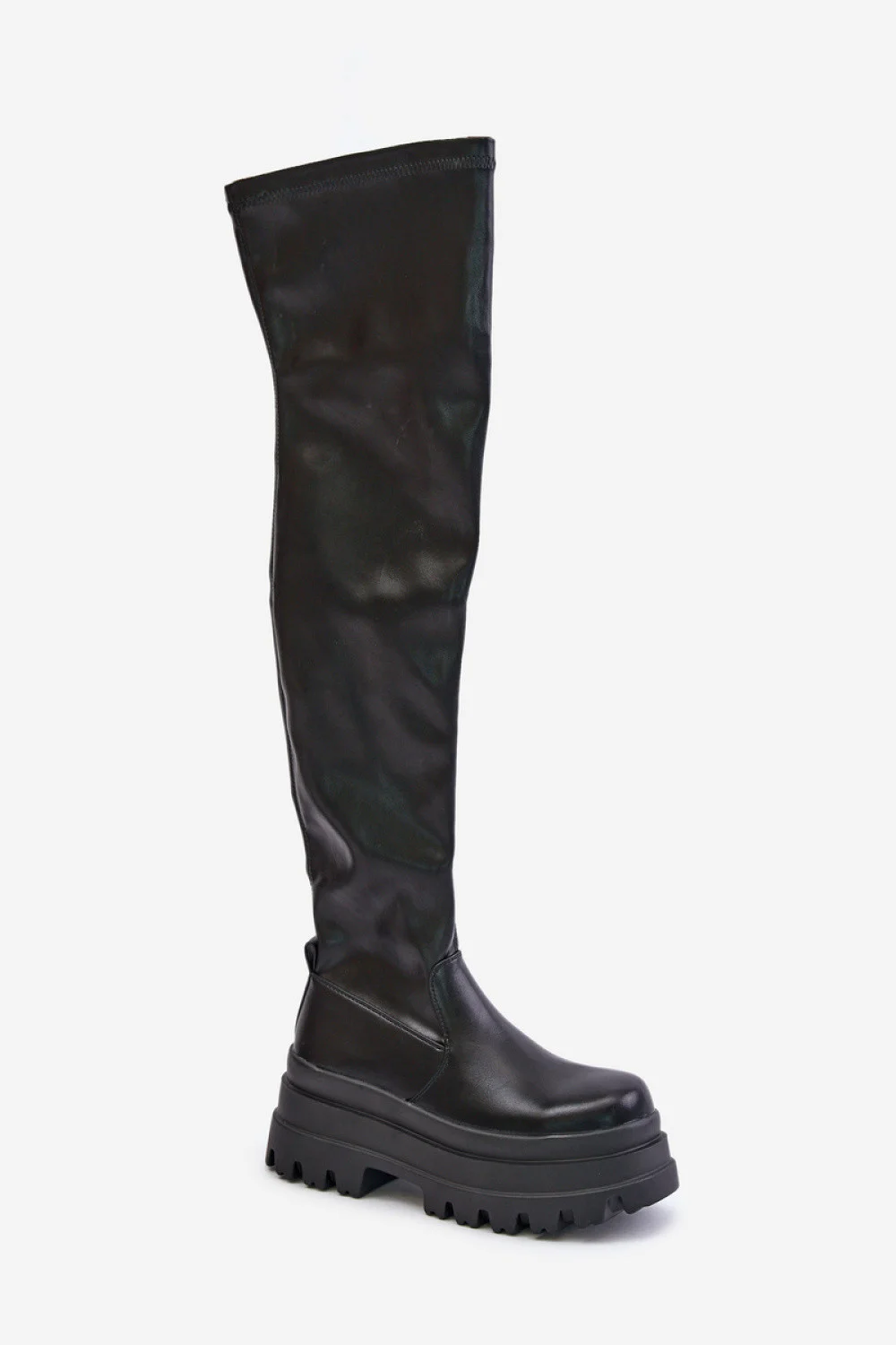Kozačky nad koleno osazené na masivní platformě jsou stylovou volbou na chladné dny. Model se zasouvacím zipem na dolní části lýtkového svršku usnadňuje obouvání a přizpůsobení. Vytápěné pouze na úrovni chodidla poskytují teplotu a pohodlí nošení. Moderní střih, který přidá charakter každému outfitu.