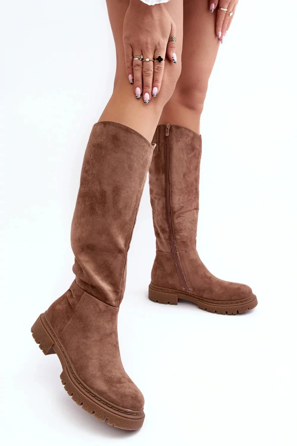 Dámské boty byly vyrobeny z ekologického semiše. Stojí na plochém podpatku. Svršek před kolenem. Zaoblená špička. Uvnitř zateplené přikrývkou na boty. Klasický střih pro mnoho podzimních a zimních outfitů!
