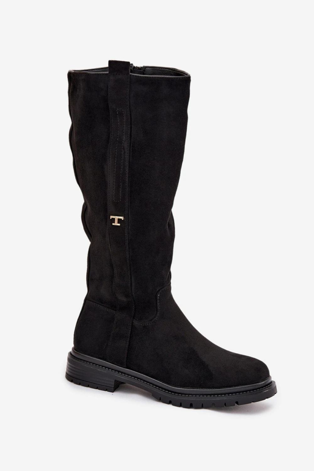 Dámské kozačky na ploché podrážce jsou praktickým a stylovým návrhem na zimní dny. Model se zapínáním na zip usnadňuje rychlé obouvání, a vnitřek vyztužený měkkým koženým kocovým materiálem zaručuje teplo a pohodlí i v nejchladnějších dnech. Jemný zlatý detail ve formě písmene T umístěný po straně svršku dodává jemný, elegantní akcent, díky čemuž se kozačky skvěle hodí do každodenních zimních stylizací.