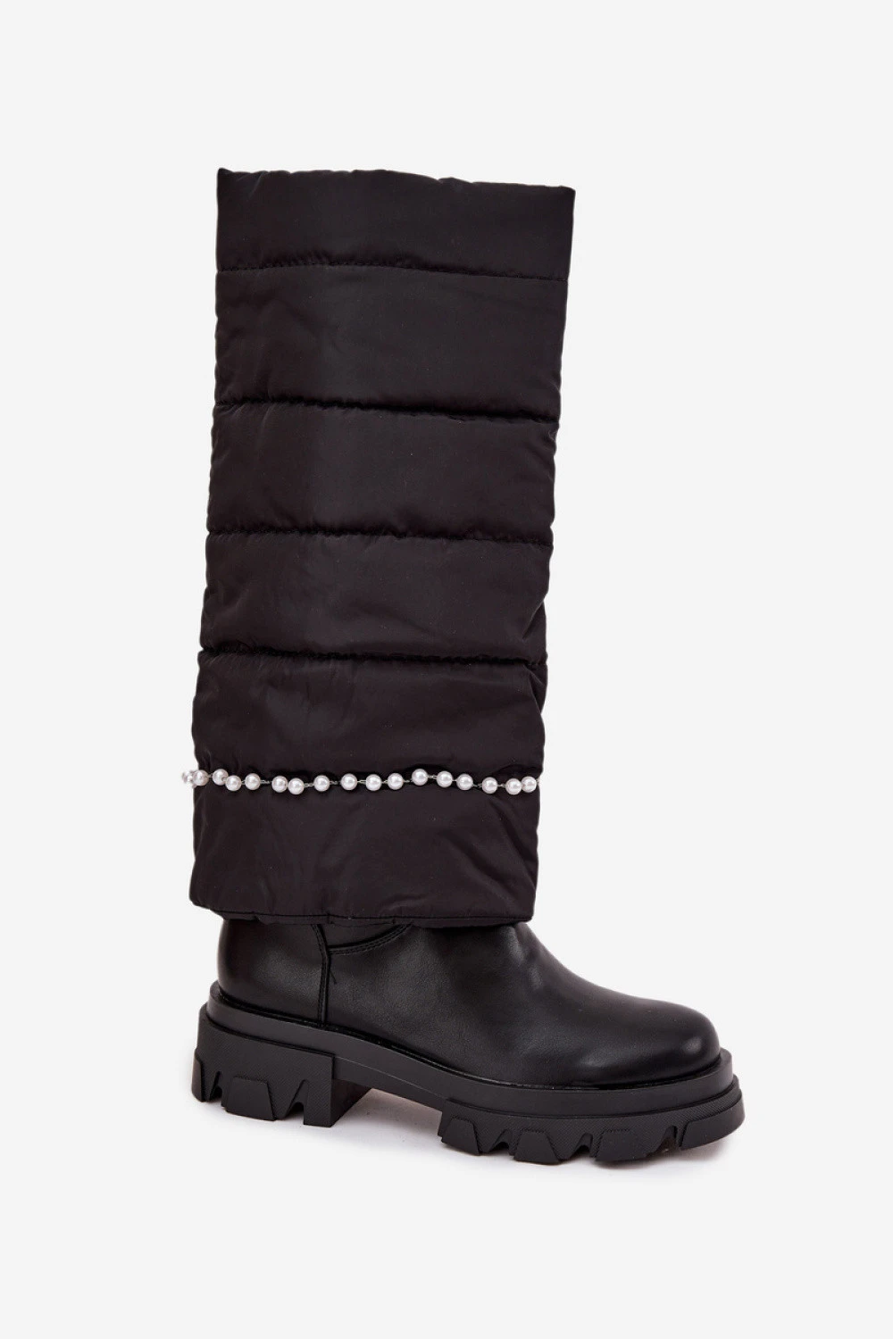 Dámské kozačky vyrobené z kombinace ekokože a textilního materiálu jsou stylovým návrhem na chladné dny. Zasouvací střih zajišťuje pohodlí při obouvání. Vnitřek vyložený koženou podšívkou zaručuje teplo a pohodlí při nošení. Zaoblené špičky zdůrazňují klasický charakter obuvi, zatímco jemné korálky představují elegantní detail, který dodává celku jedinečného kouzla. Jsou to módní a pohodlné kozačky, které se skvěle hodí do každodenních stylizací.