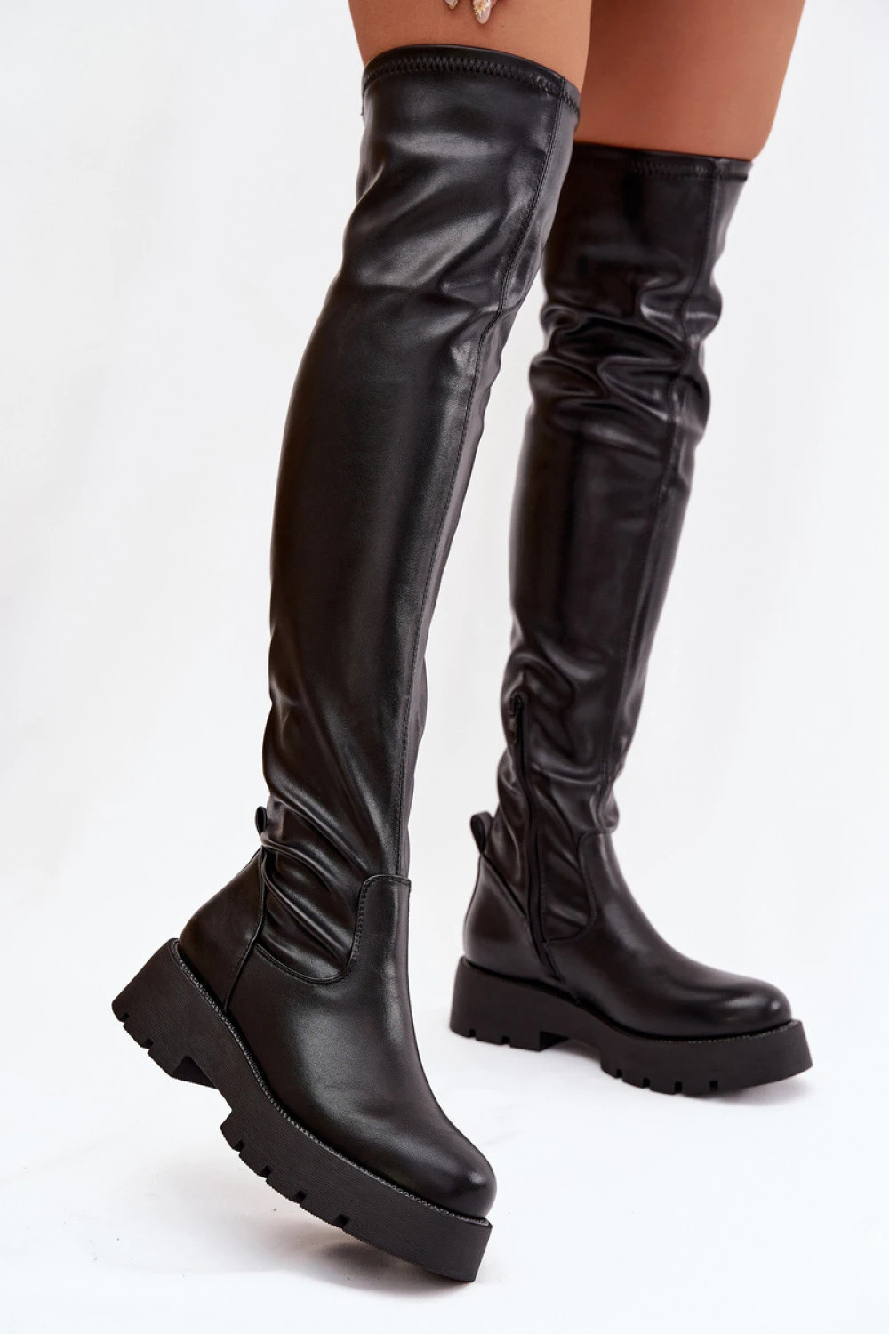 Dámské kozačky s návlekovým střihem sahajícím nad koleno jsou efektním modelem, který krásně zdůrazňuje nohy. Vsuvný střih doplněný zipem umístěným dole usnadňuje obouvání a zajistí pohodlné přizpůsobení. Na okraji podrážky jsou drobné cirkóny, které celku dodávají jemný, lesklý akcent. Ideální obuv pro stylové kombinace s šaty, sukněmi nebo koženými šortkami, skvělá jak na každý den, tak i na speciální příležitosti.