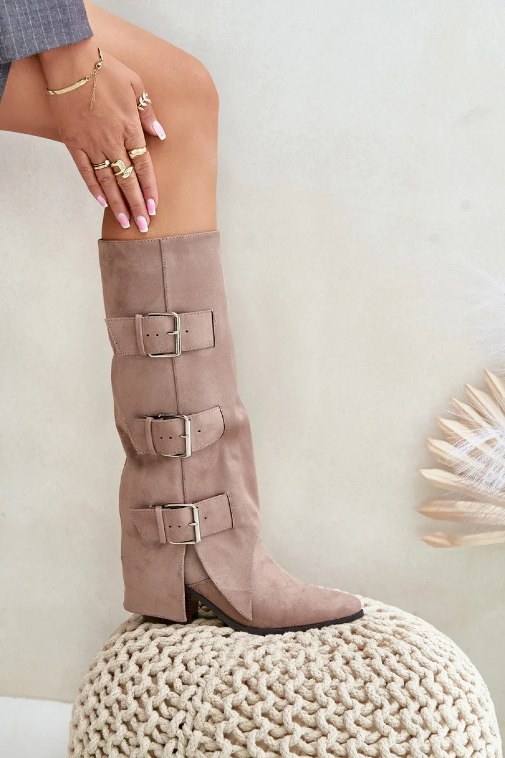 Elegantní dámské kozačky vyrobené z ekologického semiše. Umístěné na sloupcovém podpatku. Špičaté špičky. Uvnitř vyložené textilní podšívkou. Hlavní výhodou tohoto modelu je obrácený svršek zdobený zlatými sponami. Model se zasouváním s dodatečným zipem na spodku. Skvěle se hodí k volným sako, sukním a šaty! Určitě byste je měla mít!