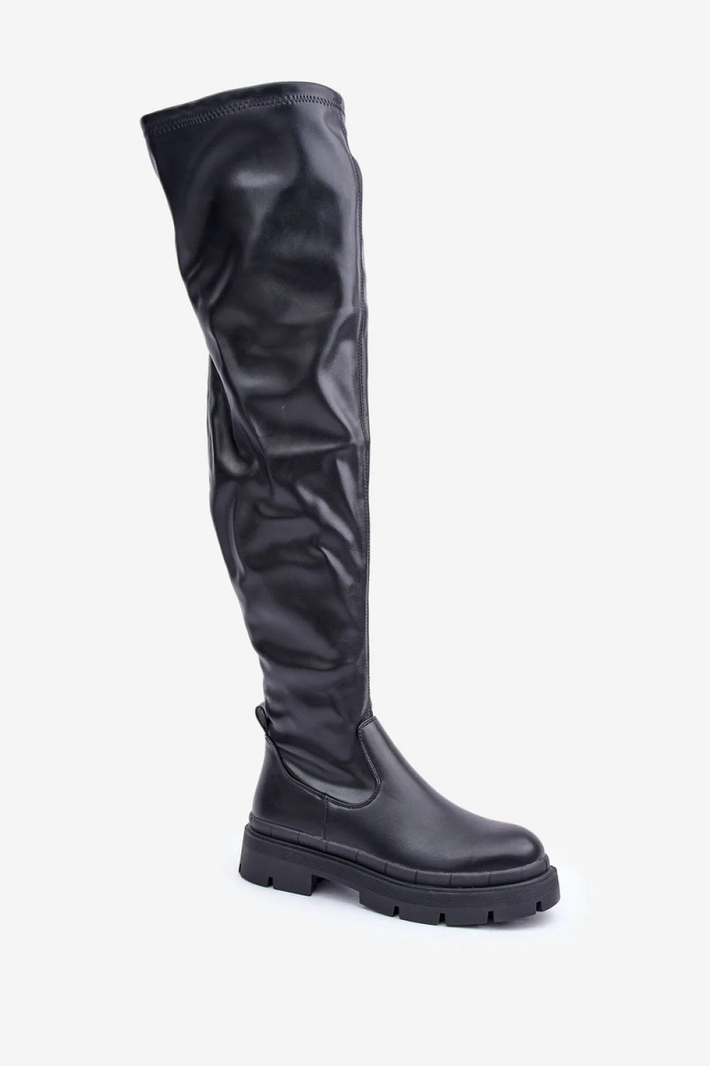 Elegantní kozačky vyrobené z ekokože jsou skvělou volbou na chladné dny. Díky ploché podrážce poskytují pohodlí, což je činí ideálními pro každodenní nošení. Tento model se vyznačuje zaoblenou špičkou a koženou, sahající nad koleno, což je dělá skvěle padnoucí k šatům a sukním, dodávající eleganci každému outfitu. Vnitřek bot je vyztužen pouze v oblasti chodidla. Tyto kozačky spojují klasický styl s funkcionalitou, ideální jak na každý den, tak na speciální příležitosti.