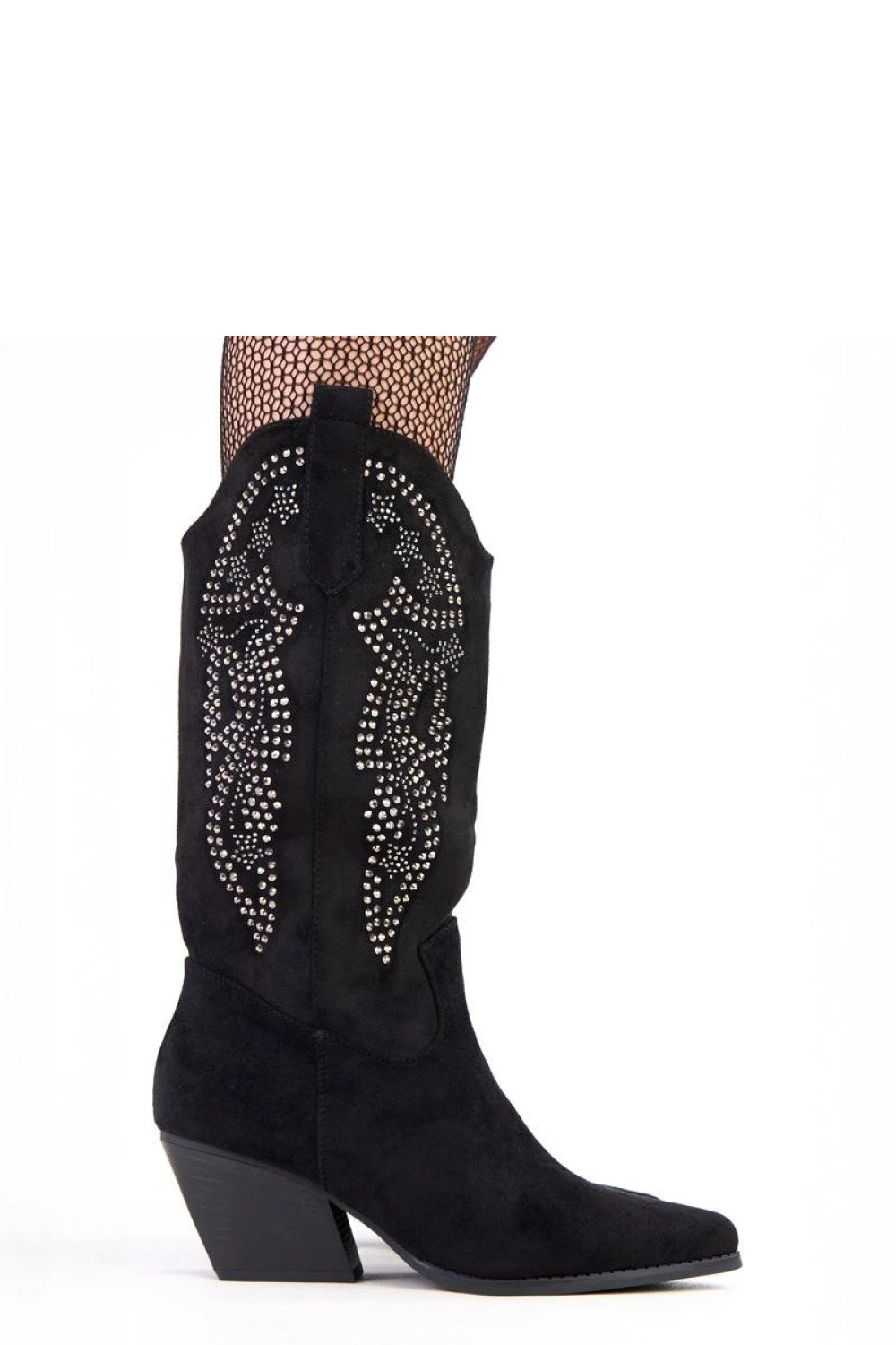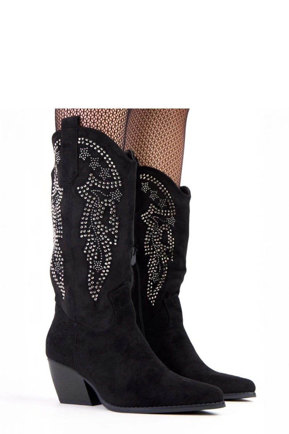 Elegantní kotníkové boty typu western vyrobené z ekologické semišové kůže spojují pohodlí každodenního nošení s módním designem. Model s klasickým špičatým nosem a stabilním sloupkovým podpatkem o výšce 6,5 cm zdůrazňuje postavu a poskytuje pohodlí při chůzi. Boty mají praktický zip a textilní vložku, která zvyšuje komfort používání. Další ozdobou jsou decentní zirkony, které dodávají celku elegantní a výrazný charakter. Ideální pro každodenní outfit nebo večerní vycházky, trendy, pohodlné a plné ženského šarmu.