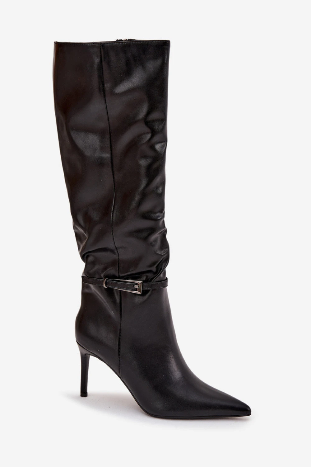 Dámské kozačky vyrobené z ekokože jsou nabídkou pro ženy, které ocení eleganci a ženský styl. Model na úzkém podpatku krásně zdůrazňuje siluetu, dodává lehkost a eleganci. Špičaté špičky opticky zjemňují nohy. Boty se zapínají na zip, co zajišťuje pohodlí při obouvání a svlékání. Spodek holek je zdobený páskem s přezkou, který představuje jemný a zároveň efektní dekorační prvek. Jsou to ideální kozačky na výjimečné příležitosti a večerní stylové výlety, ženské a elegantní, skvěle se hodící jak k sukním, tak k přiléhavým kalhotám.