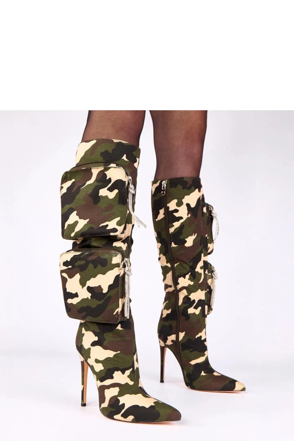 Výrazné kozačky po koleno, vyrobené z látky s efektním vzorem moro, ideální pro ženy, které rády nosí odvážné módní doplňky. Model se vyznačuje ozdobnými kapsami umístěnými na lýtku, které dodávají celku jedinečný charakter a vojenský styl. Kapsy jsou praktické a estetické, celkový dojem doplňuje zip, usnadňující obouvání. Kozačky mají špičatou špičku, která opticky prodlužuje nohy a dodává modelu elegantní vzhled. Jsou umístěny na štíhlém podpatku vysokém 11,5 cm, který zdůrazňuje siluetu a přidává ženskou sebejistotu. Lýtko vysoké 38 cm dokonale obepíná nohu, vytvářejíc efektní linii. Vnitřek je vybaven látkovou vložkou, a díky absenci podšívky se model skvěle hodí na stylové výlety v přechodném období nebo na večírky. Jsou to výjimečné kozačky, které spojují módní charakter vzoru moro se smyslnou elegancí vysoké podpatku, ideální pro ženy, které rády vynikají v davu.