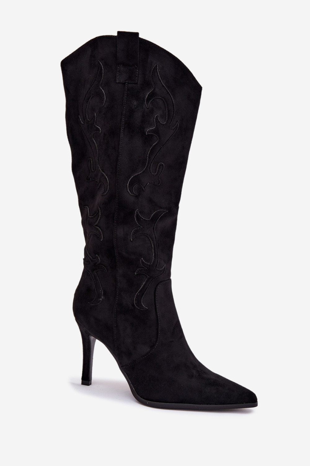 Dámské kozačky vyrobené z ekokože. Přezka inspirovaná kovbojkami jim dodává charakter a úzký podpatek a špičaté špičky zdůrazňují ženský, smyslný střih. Model se zapínáním na zip usnadňuje obouvání a zajistí pohodlné padnutí. Ideální pro stylingy, které vyžadují kombinaci elegance a módního nádechu.