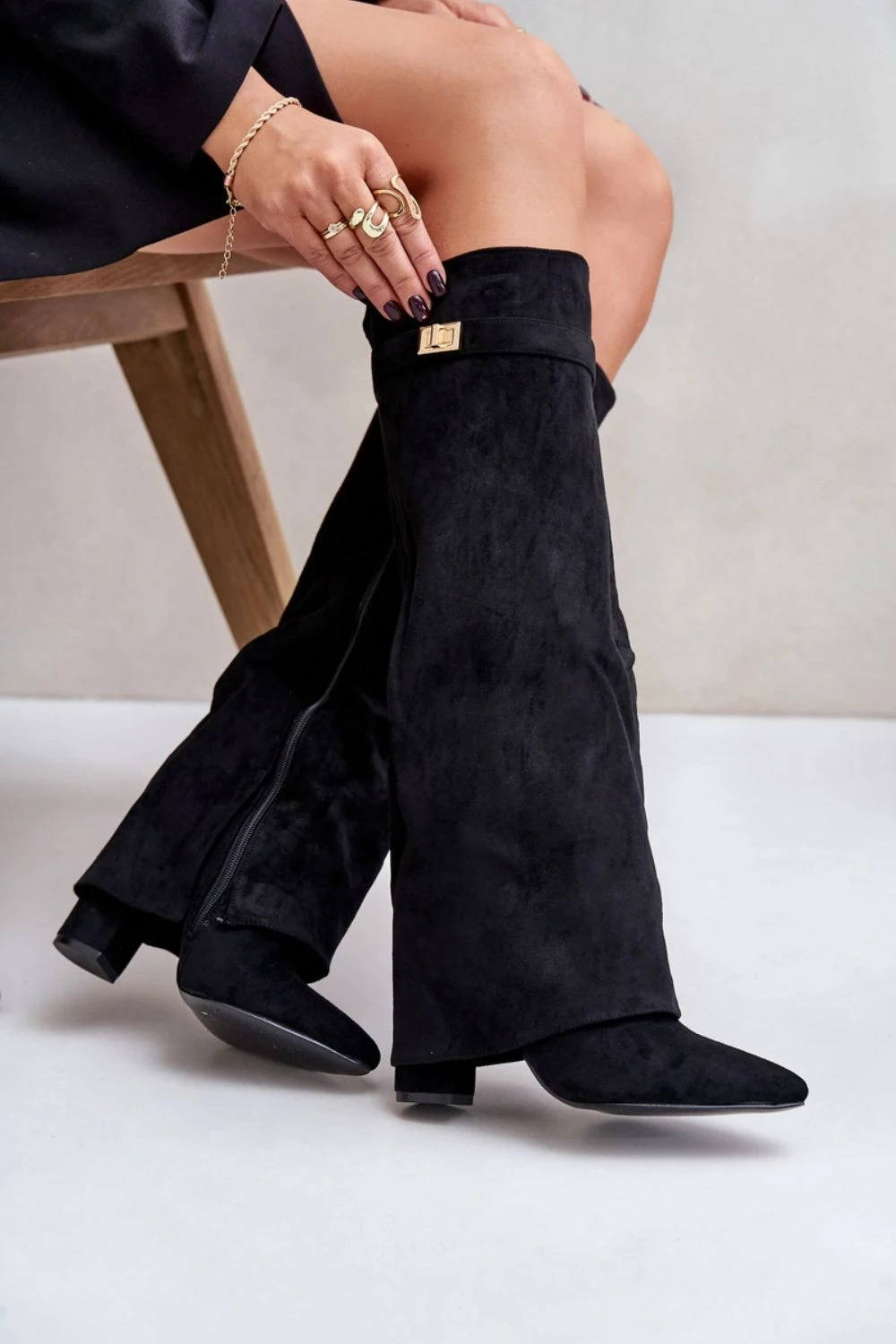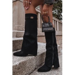 Elegantní dámské kozačky z ekologického semiše. Nastavené na sloupkovém podpatku. Špičaté špičky. Výjimečným prvkem tohoto modelu je otočený límec s odnímatelným páskem na horní části límce, který sahá až na podpatek. Zapínání na zip. Skvěle se hodí k nošení s šaty nebo sukněmi!
