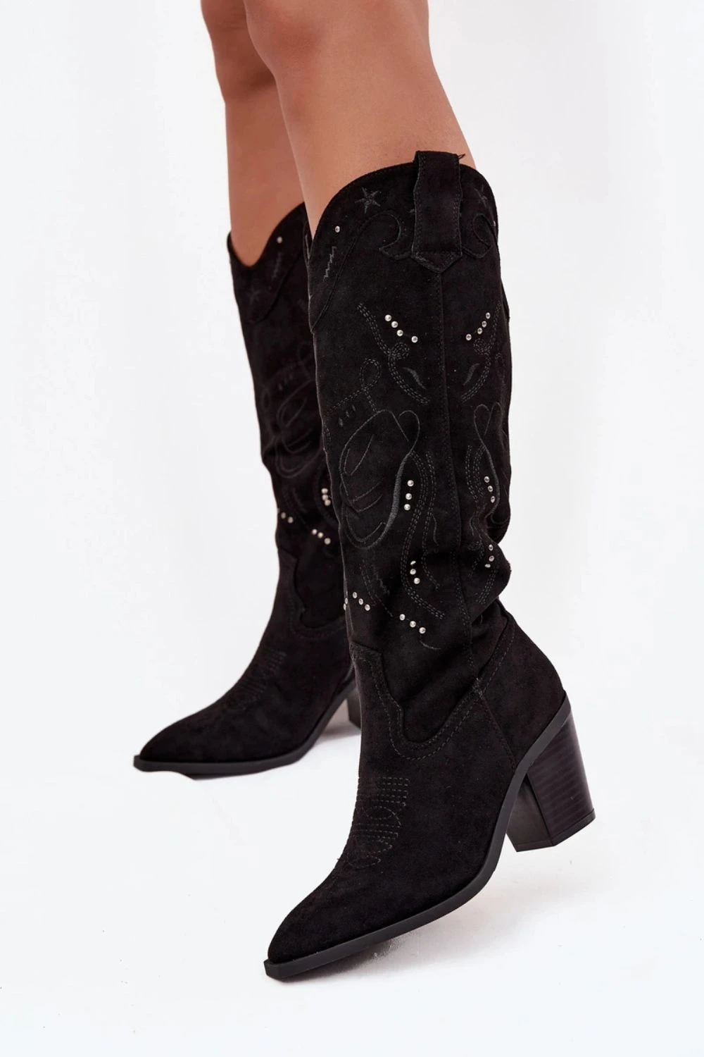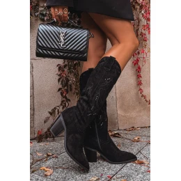 Dámské kozačky v kovbojském stylu, vyrobené z ekokožešiny, jsou návrhem, který spojuje klasiku s módním, výrazným charakterem. Umístěné na stabilním, špičatém sloupkovém podpatku dodávají postavě štíhlost, zároveň zaručují pohodlí během chůze. Model se vyznačuje ozdobnými prošitími a jemnými zlatými prvky. Mandlové špičky zdůrazňují ženský styl a praktický zip umístěný v dolní části lýtkového střihu usnadňuje obouvání. Jsou to ideální kozačky pro podzimně-zimní styly, skvěle ladí jak s přiléhavými kalhotami, tak s šaty ve stylu boho.
