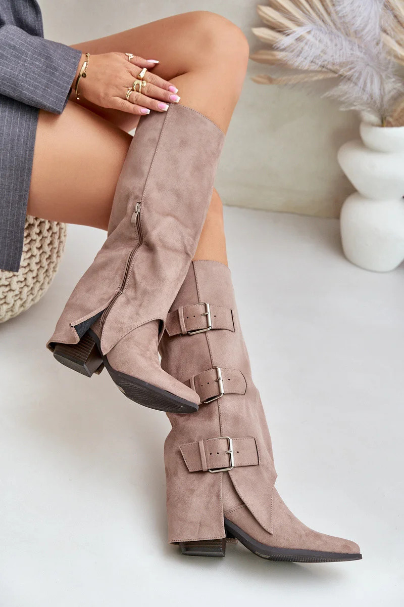 Kozačky Na Podpatku S Ohnutou Holení A Přezkami Béžové Vamissa