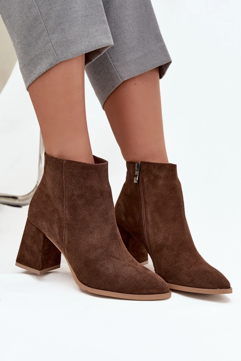 Dámské kotníkové boty vyrobené z přírodního semiše jsou elegantní a nadčasovou volbou, která se skvěle hodí do podzimně-zimního období. Vysoce kvalitní kůže jim dodává elegantní vzhled a zajišťuje odolnost, zatímco stabilní podpatek ve tvaru sloupu prodlužuje siluetu, přičemž zaručuje pohodlí a jistotu kroku i při delším nošení. Mandlové špičky podtrhují ženský charakter bot, což je činí ideální volbou jak k tradičním, tak moderním stylizacím. Díky praktickému zapínání na zip jsou boty snadné na obouvání a sundávání, což zvyšuje komfort při nošení. Vyhřívané vnitřní prostředí chrání před chladem a umožňuje použití i v chladnější dny. Jedná se o model, který úspěšně doplní každodenní ležérní i elegantní outfity. Při výběru velikosti prosíme podle tabulky velikostí. Při výběru velikosti se řiďte tabulkou velikostí.