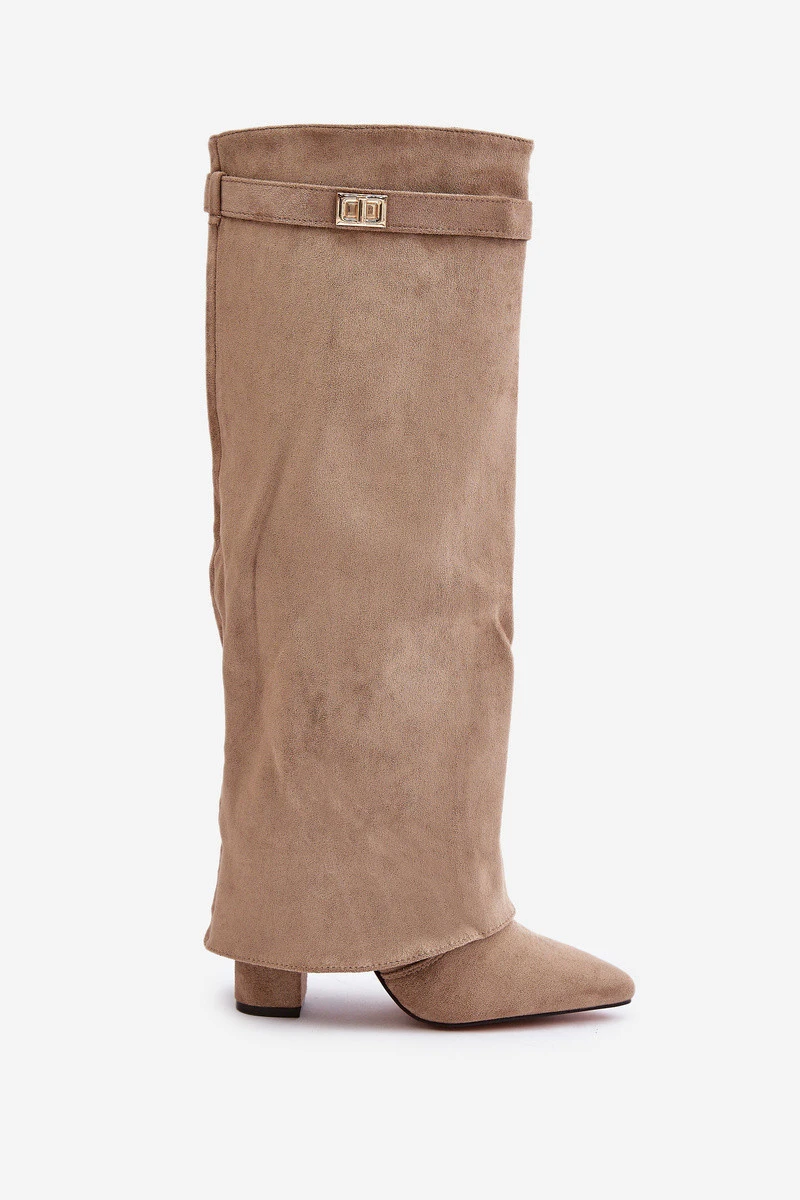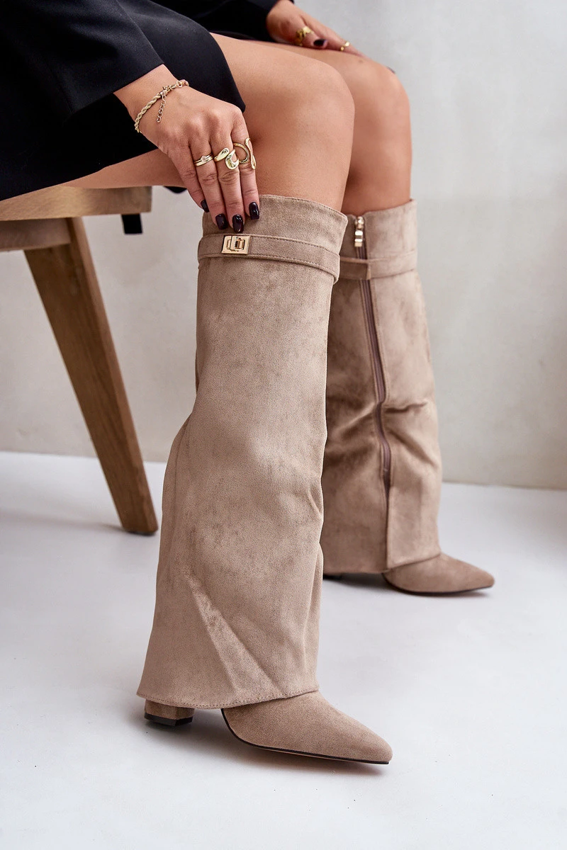 Elegantní dámské kozačky z ekologické semiše. Umístěné na sloupkovém podpatku. Špičky do špice. Výjimečným prvkem tohoto modelu je ohrnutá holenní část s odnímatelným páskem na vrchu, který se překrývá s podpatkem. Zapínání na zip. Skvělé k nošení s šaty nebo sukněmi! Při výběru velikosti se řiďte tabulkou velikostí.
