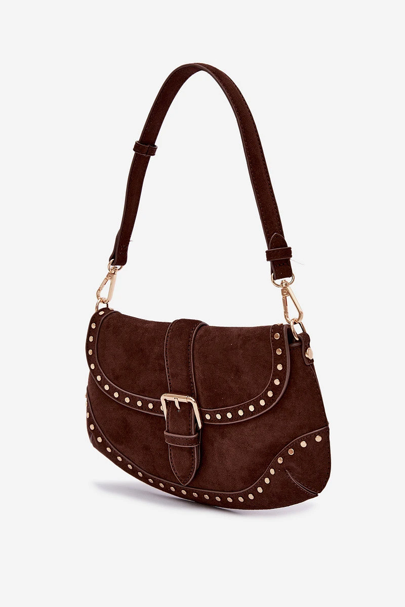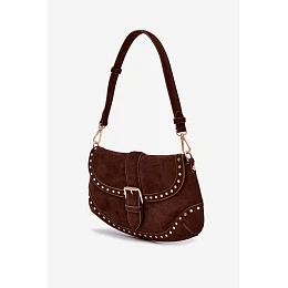 Malá dámská kabelka vyrobená z eko semiše. Její kompaktní rozměr ji činí ideální na každý den i na výlety, když potřebujete mít u sebe pouze nejdůležitější věci. Model má klapku zapínanou na magnetický klips, což zajišťuje pohodlí při používání. Kabelka je ozdobena zlatými nýty, které jí dodávají výrazný a moderní styl. Součástí jsou dva odnímatelné pásky – kratší na nošení přes rameno a delší, nastavitelné, umožňující nošení přes rameno. Uvnitř je kapsa na zip, ideální na drobnosti vyžadující dodatečné zabezpečení. Rozměry: šířka - 27 cm, výška - 16 cm, tloušťka - 3 cm.