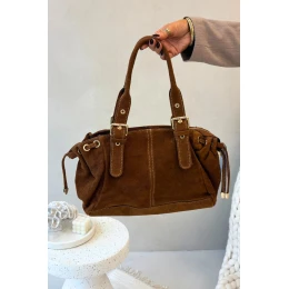 Dámská kabelka vyrobena z přírodního semiše je elegantní a stylový doplněk, který zvýrazní každý outfit. Model vyniká zlatými kováními a ozdobnými pásky s přezkami. moderního charakteru. Kabelka se zapíná na zip a její dvoukomorové uvnitř s praktickými kapsami umožňuje udržet pořádek a pojmout všechny nezbytné drobnosti. Ideální volba pro ženy, které ocení spojení elegance, funkčnosti a nadčasového stylu.