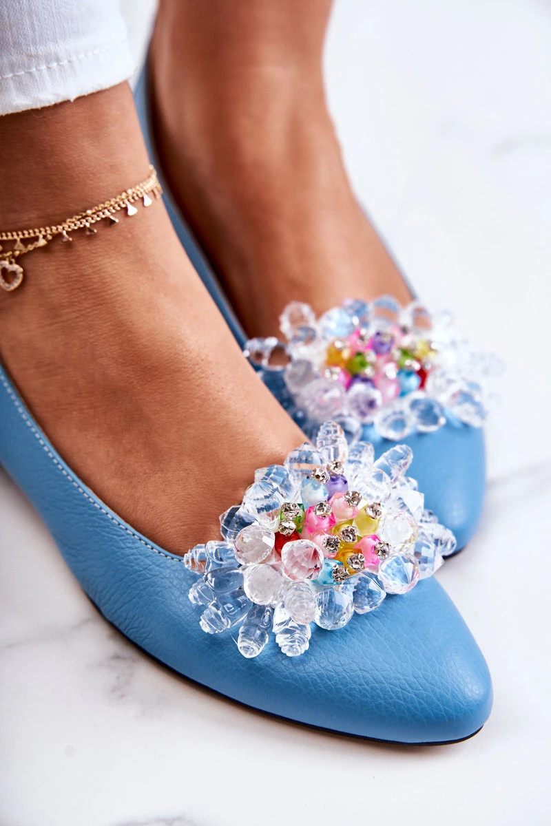 Elegantní balerínky vyrobené z vysoce kvalitní přírodní kůže. Mají špičatý prst. Nazouvací model. Jsou nasazeny na malém plochém podpatku. Na přední straně je krásná ozdoba z imitace krystalů a zrcadlových koulí. Stélka z přírodní kůže je velmi měkká a příjemná na nošení. V těchto balerínkách se budete cítit maximálně pohodlně. Komfort používání zaručen! Rozhodně byste je měli mít ve svém šatníku! Při výběru velikosti použijte tabulku velikostí.