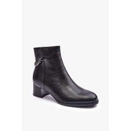 Klasické dámské boty na nízkém podpatku s lesklým prvkem. Vyrobeno z ekologické kůže. Zapíná se na zip na vnitřní straně. Horní část je ozdobena řetězem s kamínky. Vnitřek je zateplen kožešinou. Špička je zesílená a špička je zaoblená. Při výběru velikosti se řiďte tabulkou velikostí.