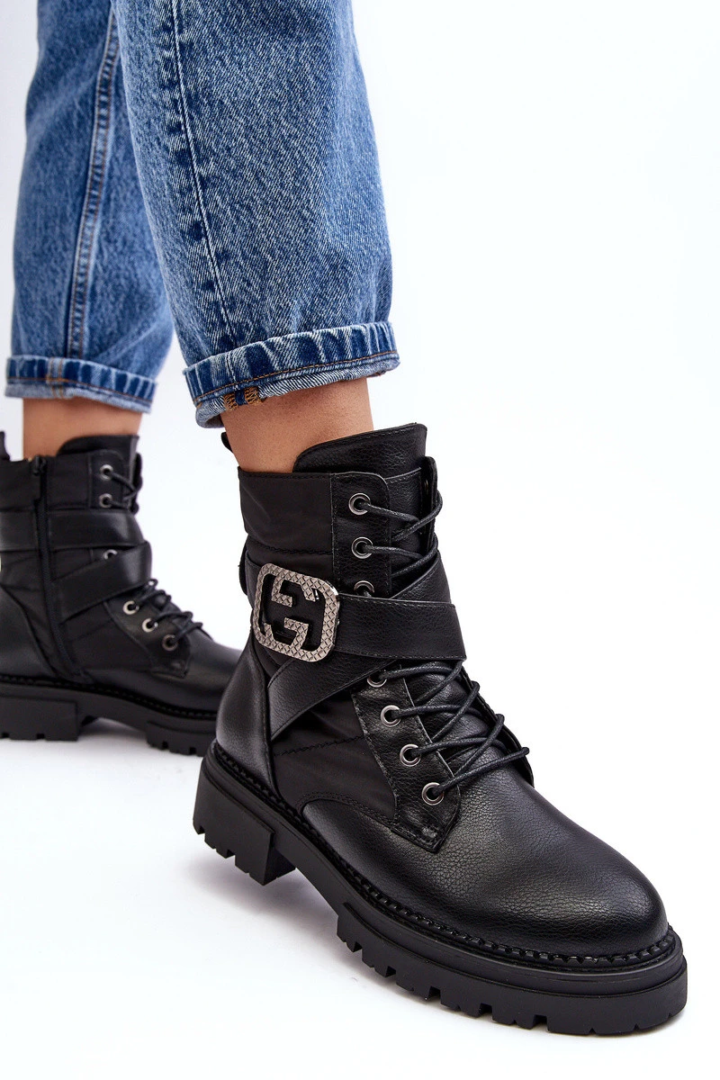Módní dámské boty na ploše a platformě. Svršek ozdobený řetězem. Tento model je vyroben z ekologické kůže. Boty jsou uzavřeny zipem a mají navíc šněrování. Špička je zaoblená, patka je zpevněná. Vnitřek je zateplen obuvním kožíškem. Při výběru velikosti se řiďte tabulkou velikostí.