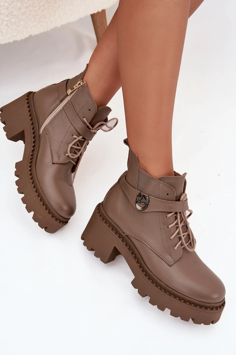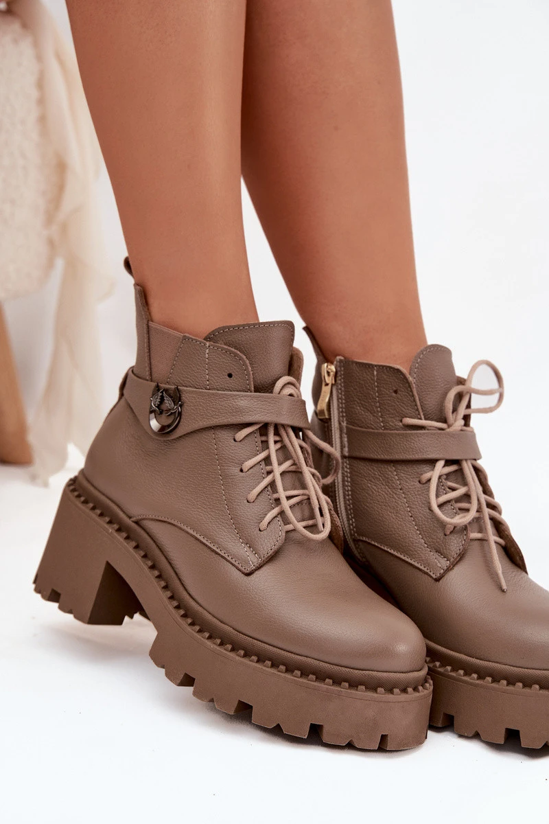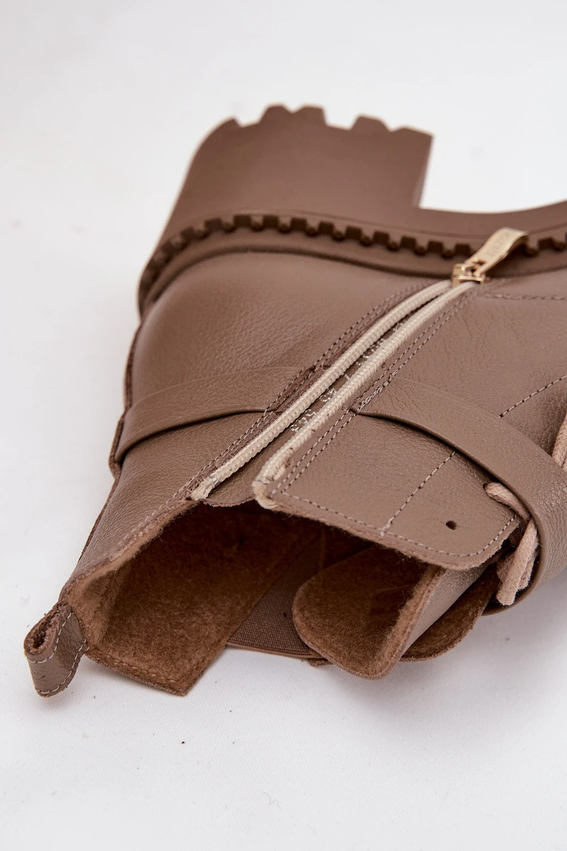 Kožené dámské kotníkové boty na klínu s ozdobným páskem zateplené model 21710528 tmavě béžové - Zazoo