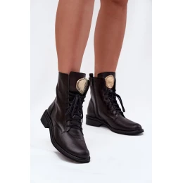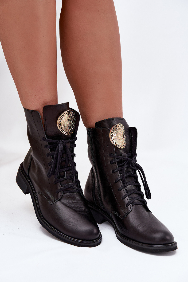 Kožené dámské kotníkové boty na ploché podrážce se zlatým detailem model 21707552 Černé - Zazoo