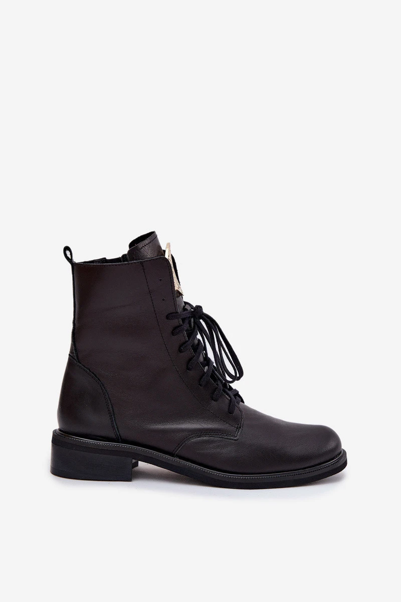 Dámské kožené kotníkové boty jsou spojením klasiky a moderního vzhledu. Umístěny na plochém podpatku, zajišťují pohodlí a stabilitu po celý den. Šněrování umožňuje dokonalé přizpůsobení a další zip usnadňuje obouvání. Na jazyku je zlatý detail, který dodává elegantní charakter. Tyto boty se skvěle hodí k různým stylům, kombinují pohodlí s módním akcentem. Při výběru velikosti se řiďte tabulkou velikostí. Při výběru velikosti se řiďte tabulkou velikostí.