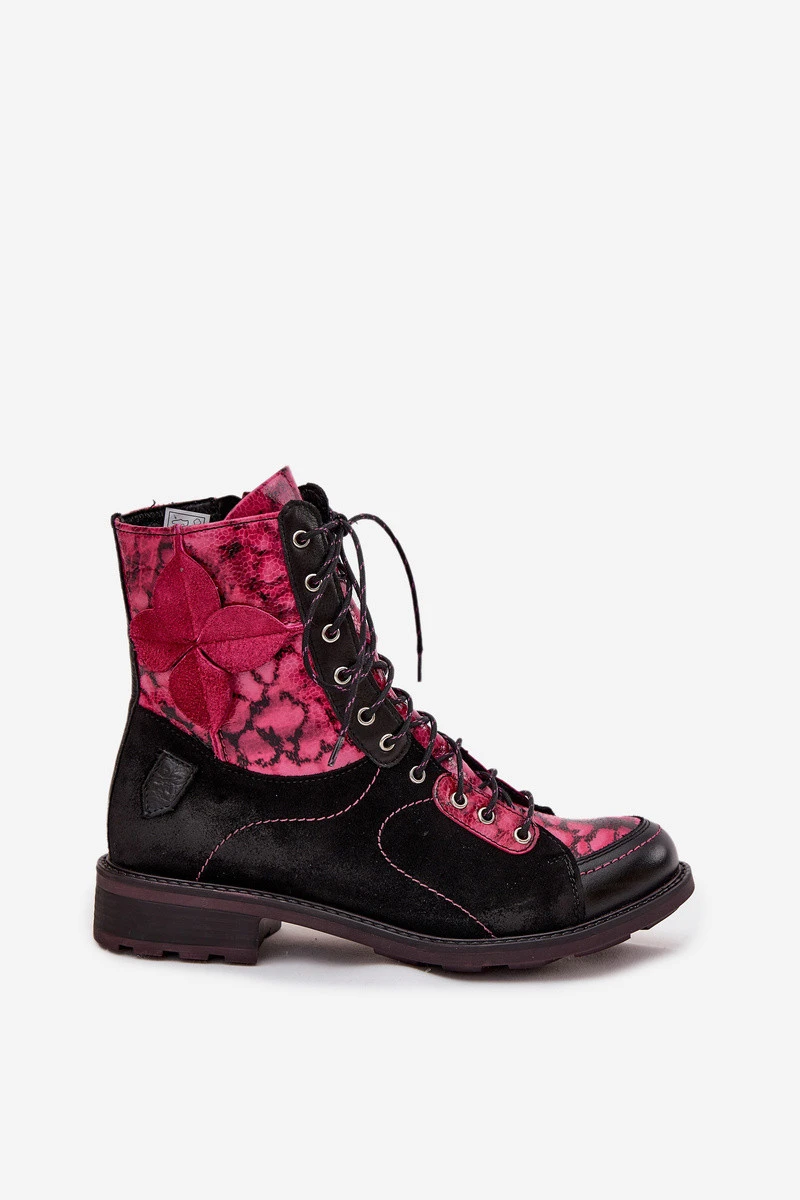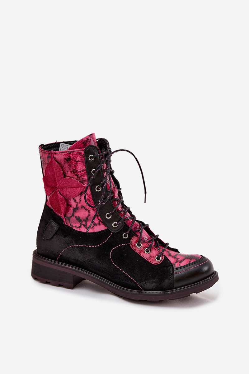 [Kožené dámské kotníkové boty z přírodní kůže na ploché podrážce Maciejka 07004-23 Černo-růžové]