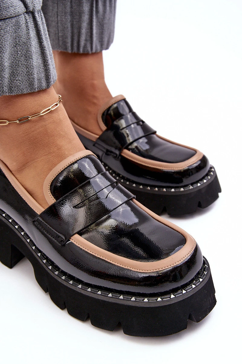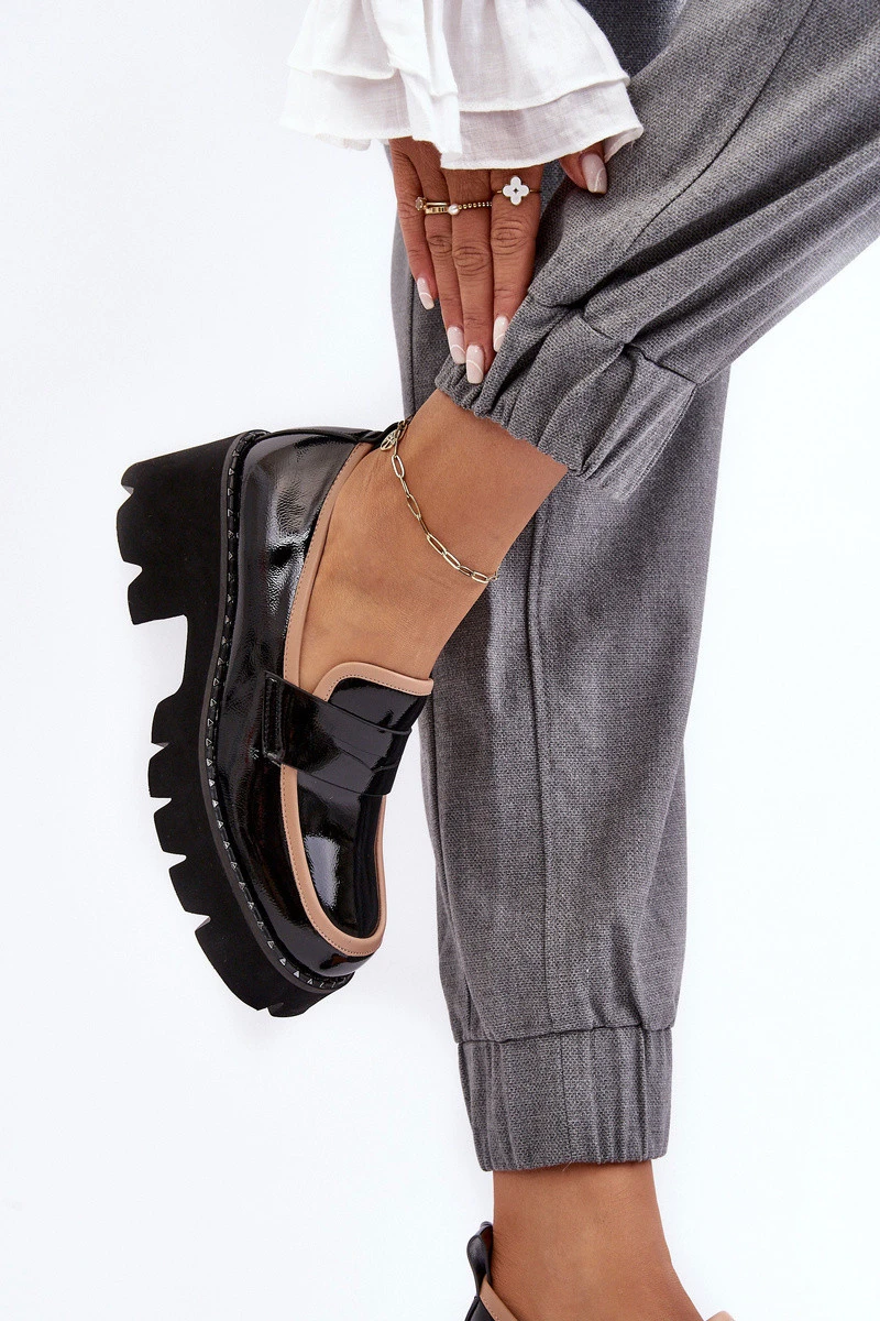 Dámské mokasíny byly vyrobeny z ekologické kůže. Na přední straně mají ozdobný pás s vyřezávanou výzdobou. Tento model je umístěn na plochém podpatku a platformě, která je navíc zdobena kamínky. Mokasíny mají vložku z přírodní kůže. Tento model je skvělý na jarno-podzimní sezónu! Při výběru velikosti se řiďte tabulkou velikostí.