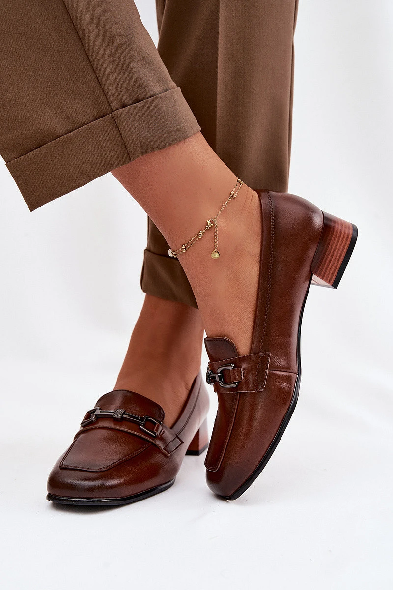 Kožené dámské polobotky na podpatku s ozdobou model 22069498 hnědé - VINCEZA