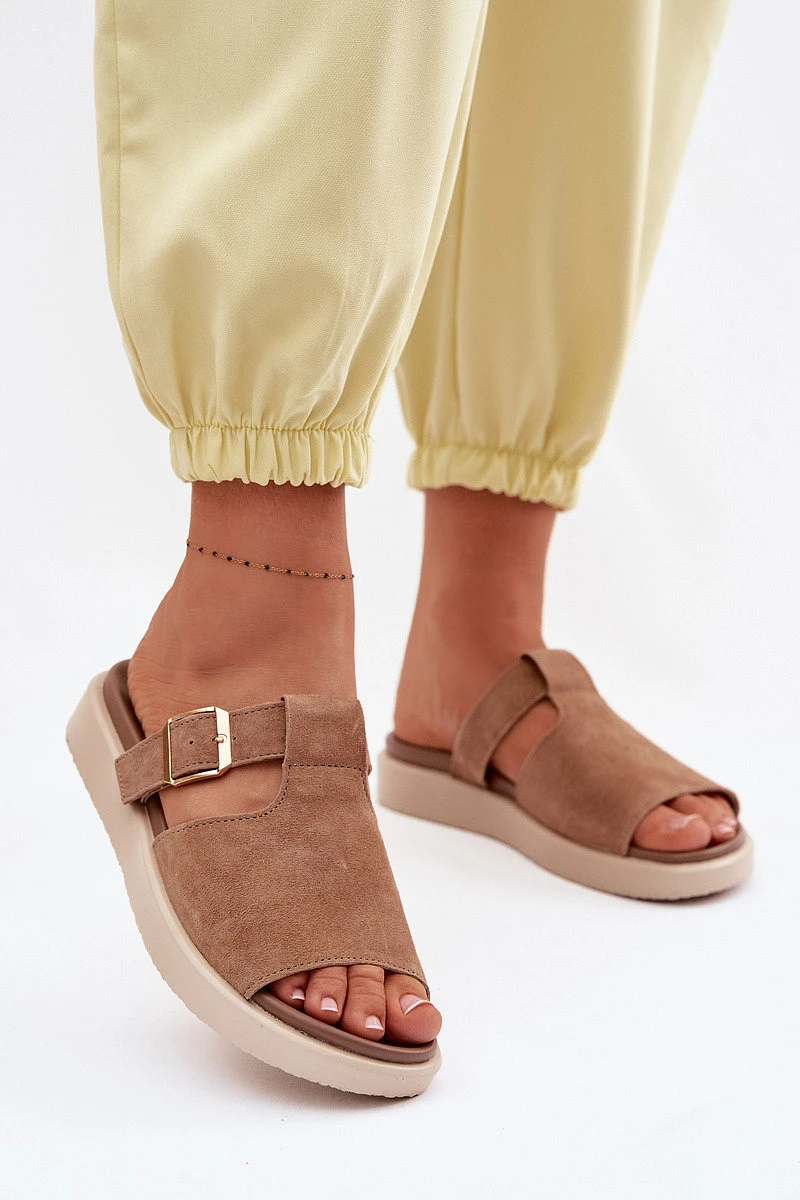 Dámské nazouváky vyrobené z přírodního semiše jsou stylovým tipem na teplé dny. Měkký, vysoce kvalitní materiál jim dodává elegantní vzhled a zároveň zajišťuje pohodlí při každodenním nošení. Model je osazen na platformě, která jemně zvedá siluetu a zaručuje stabilitu a pohodlí při chůzi. Pásek se zlatou sponou plní jak praktickou, tak dekorativní funkci – umožňuje lepší přizpůsobení a dodává celku módní charakter. Ideální volba pro ženy, které ocení spojení komfortu, kvality a moderního stylu. Při výběru velikosti se řiďte tabulkou velikostí.
