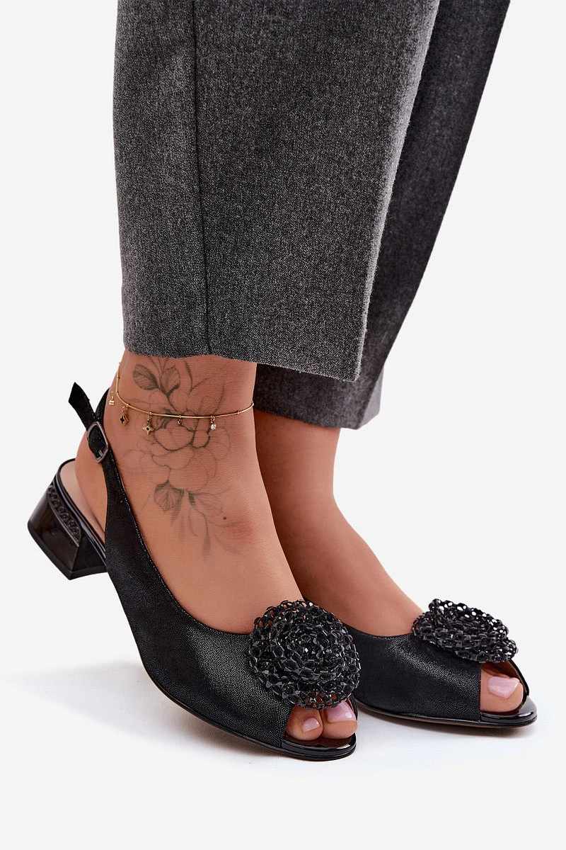 Kožené dámské sandály na podpatku s ozdobou model 22136706 Černé - D&A