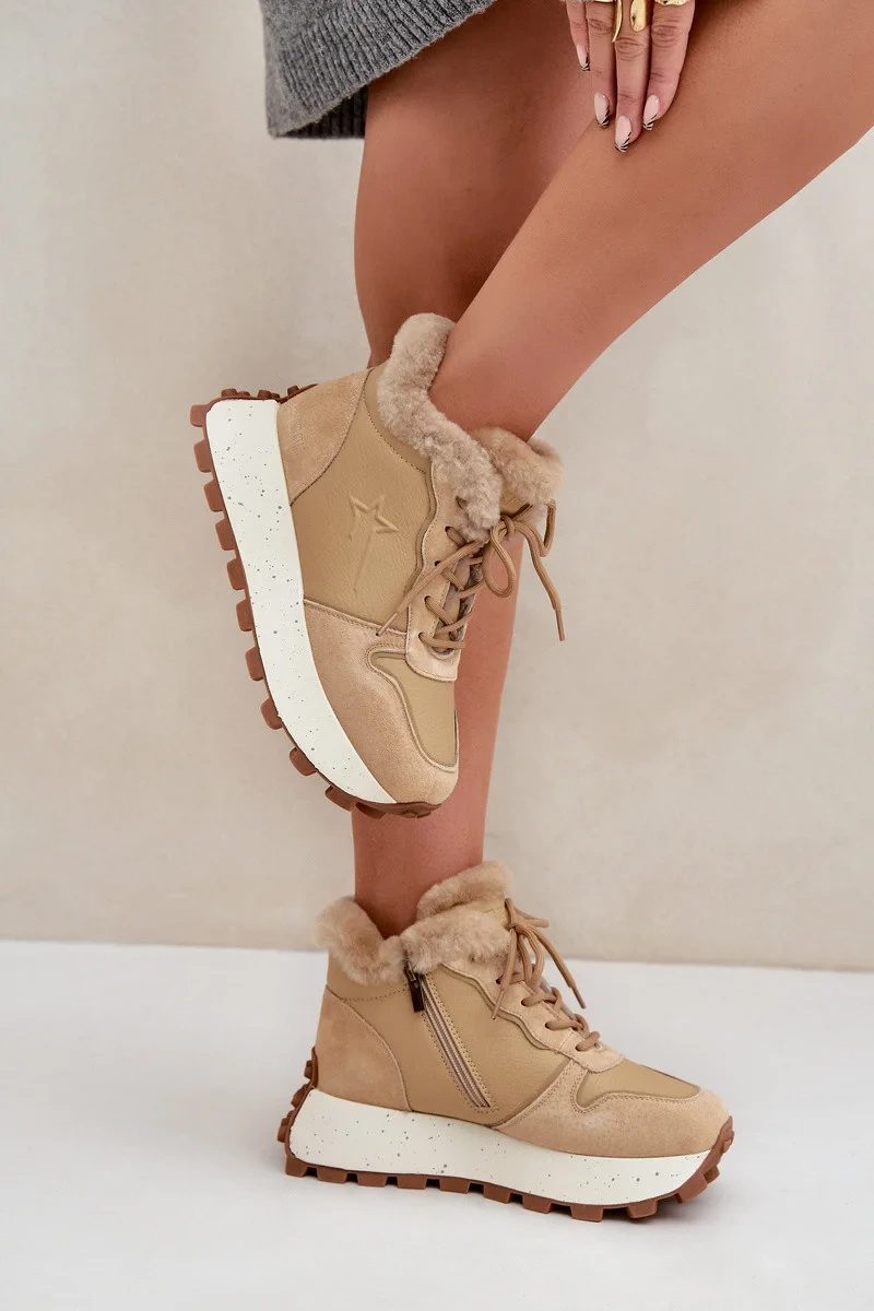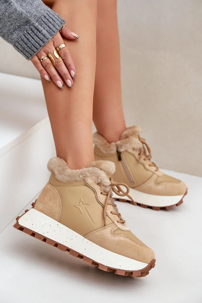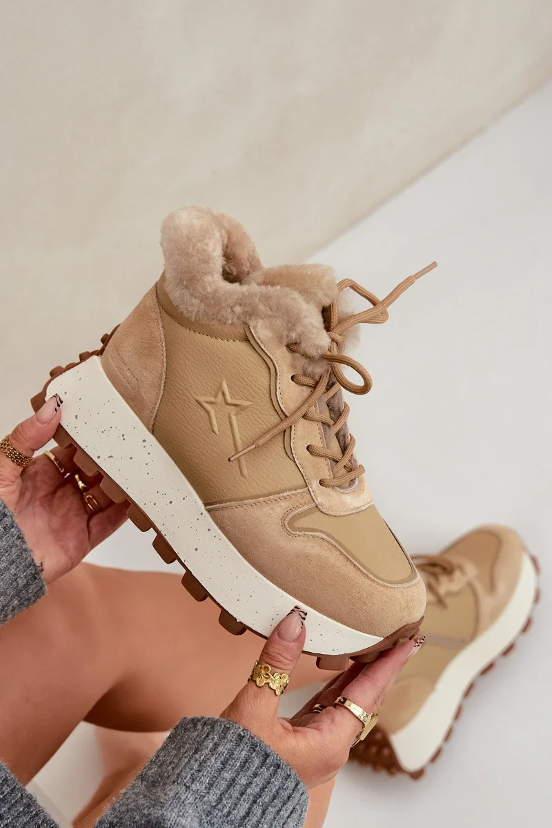 Kožené dámské tenisky trapery s kožíškem na platformě Big Star OO274A330 béžové