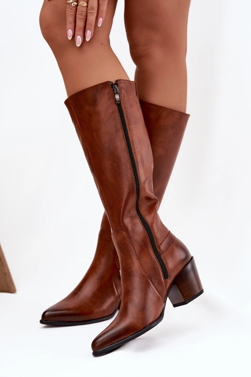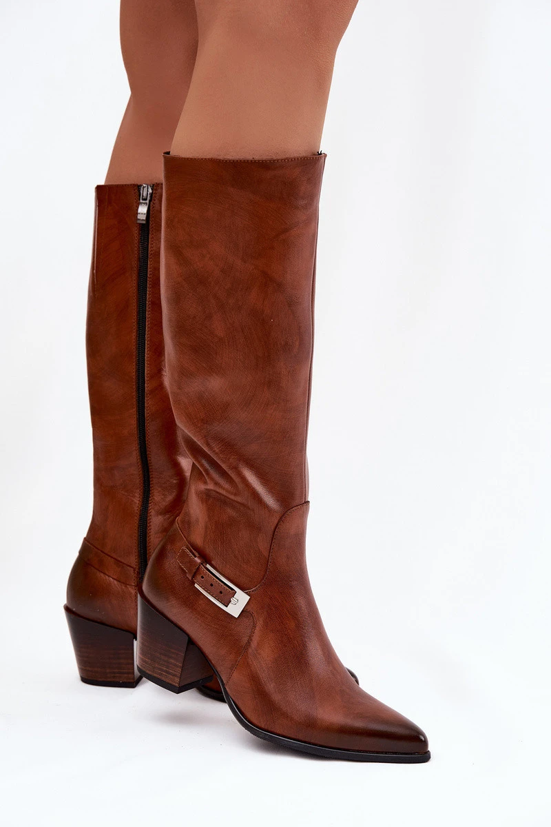 Kožené Kozačky Na Podpatku S Přezkou Zateplené model 21772427 Hnědé - Zazoo