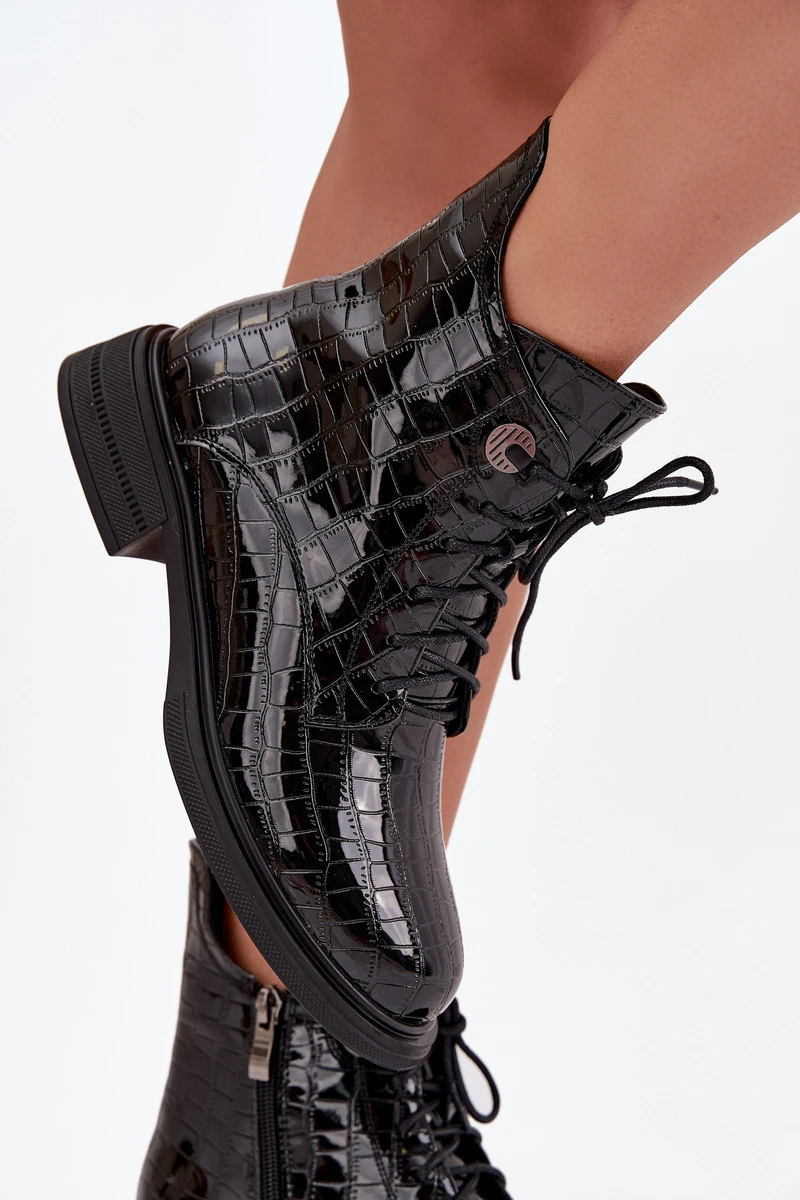 Dámské kozačky vyrobené z přírodního, lakovaného kůže jsou stylovou volbou na chladnější dny. Lesklý povrch jim dodává elegantní a moderní charakter. Model se zapíná na zip a je doplněn šněrováním, což umožňuje dokonalé přizpůsobení noze a pohodlné obouvání. Vnitřek bot je zateplený, což zajišťuje teplo a komfort i v chladnějších dnech. Jedná se o spojení klasiky a městského stylu – ideální pro každodenní oblečení i elegantnější outfity. Při výběru velikosti prosíme dle tabulky velikostí. Při výběru velikosti se řiďte tabulkou velikostí.