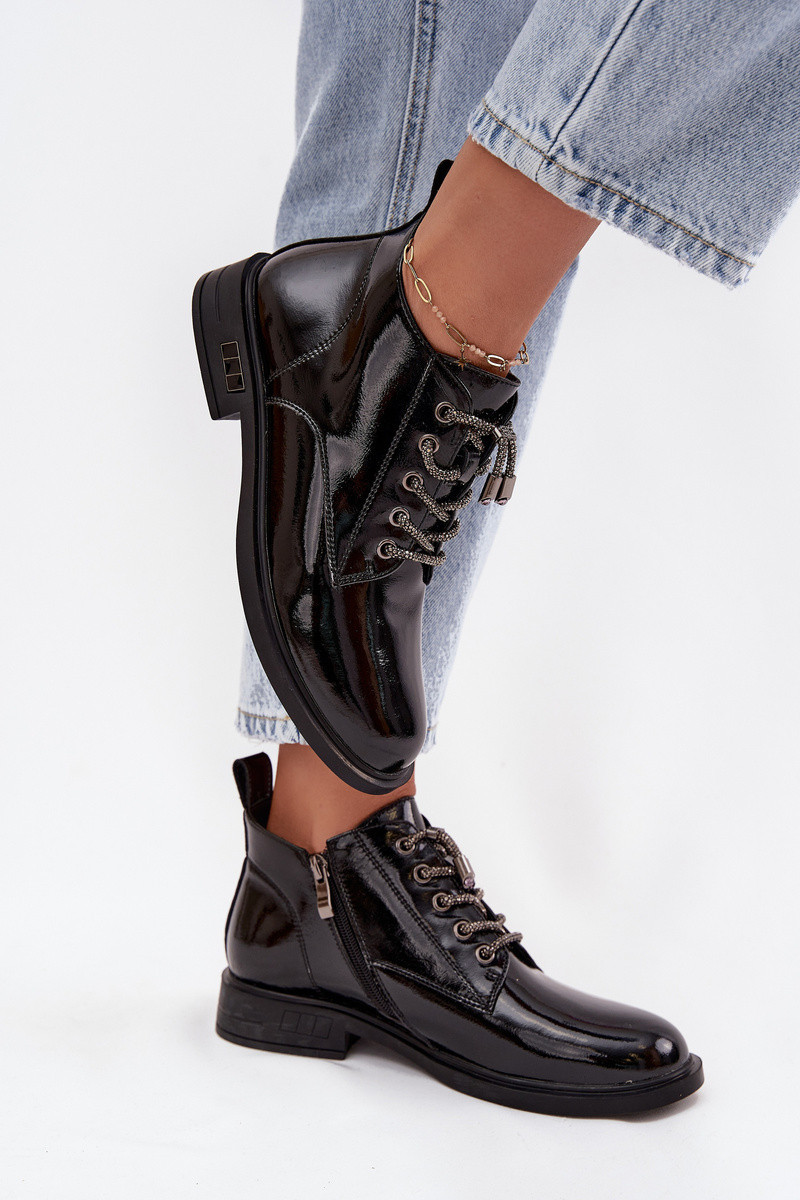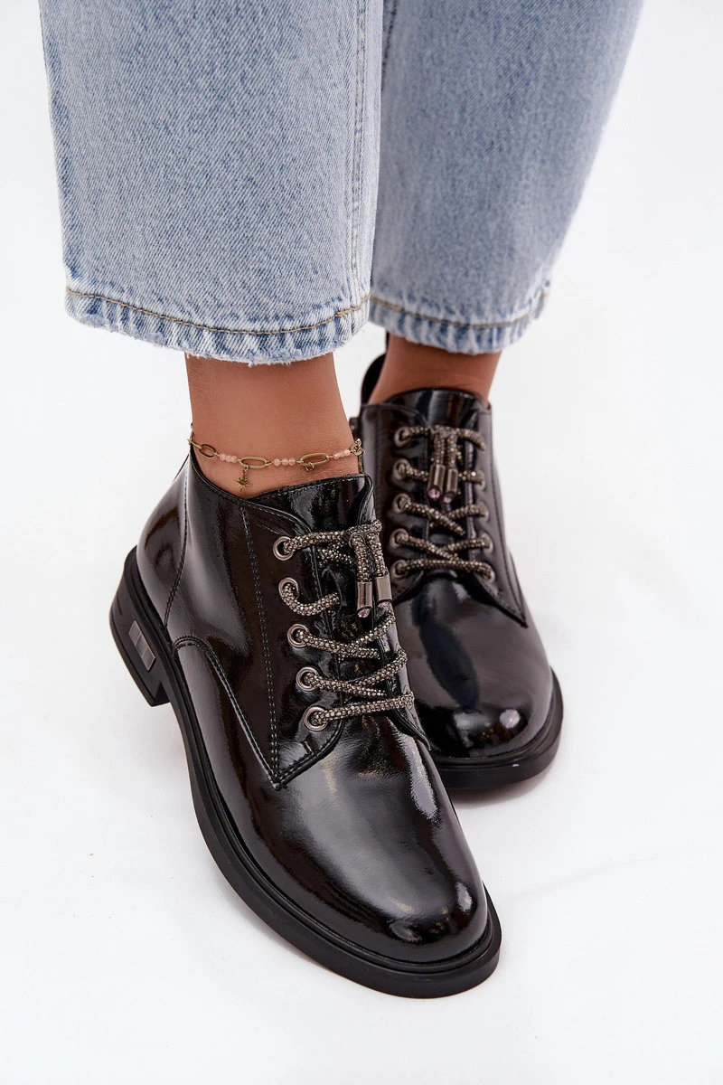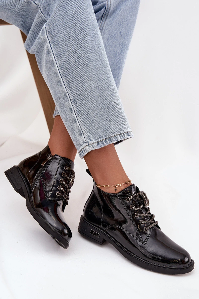 Kožené lakované dámské kotníčkové boty s ozdobným šněrováním model 21713881 Černé - D&A