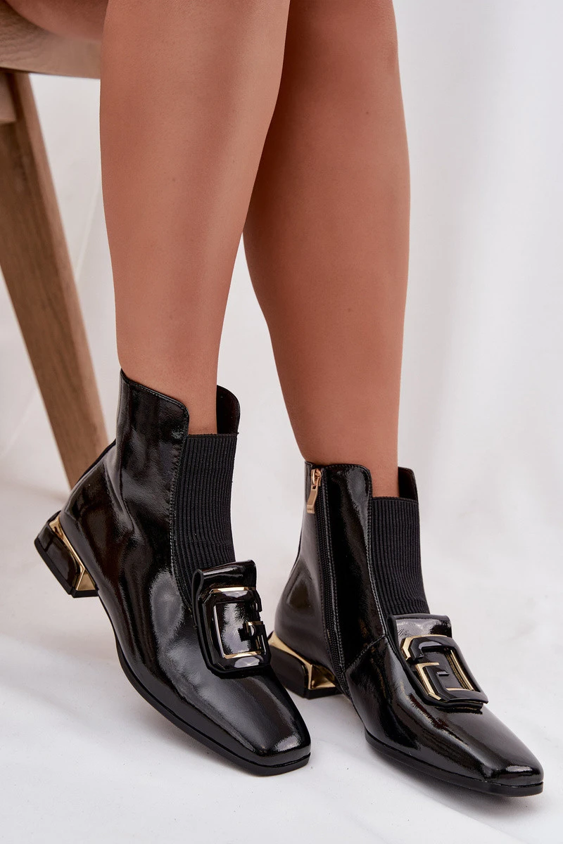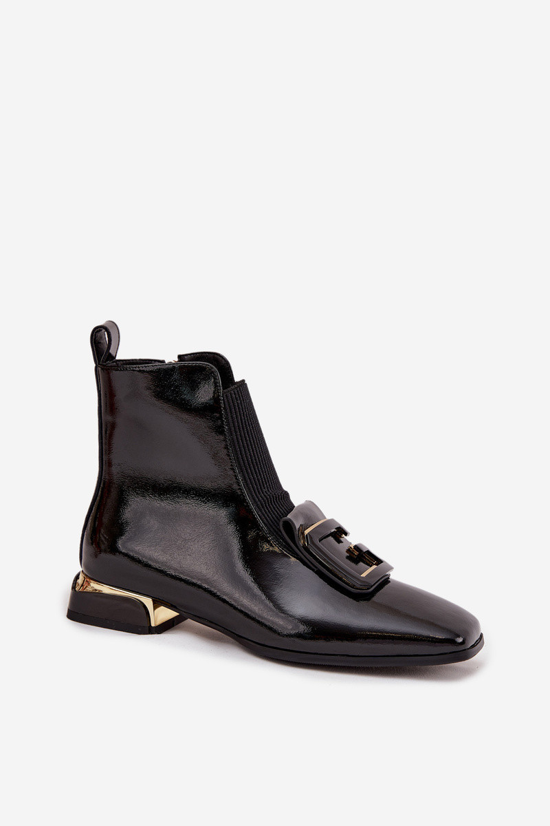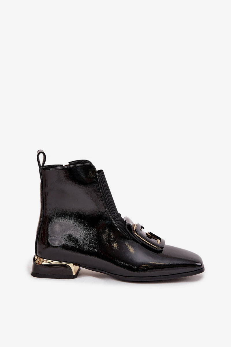 Kožené lakované dámské kotníkové boty na nízkém podpatku s ozdobou model 21715514 Černé - D&A