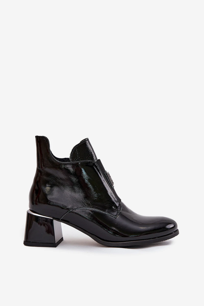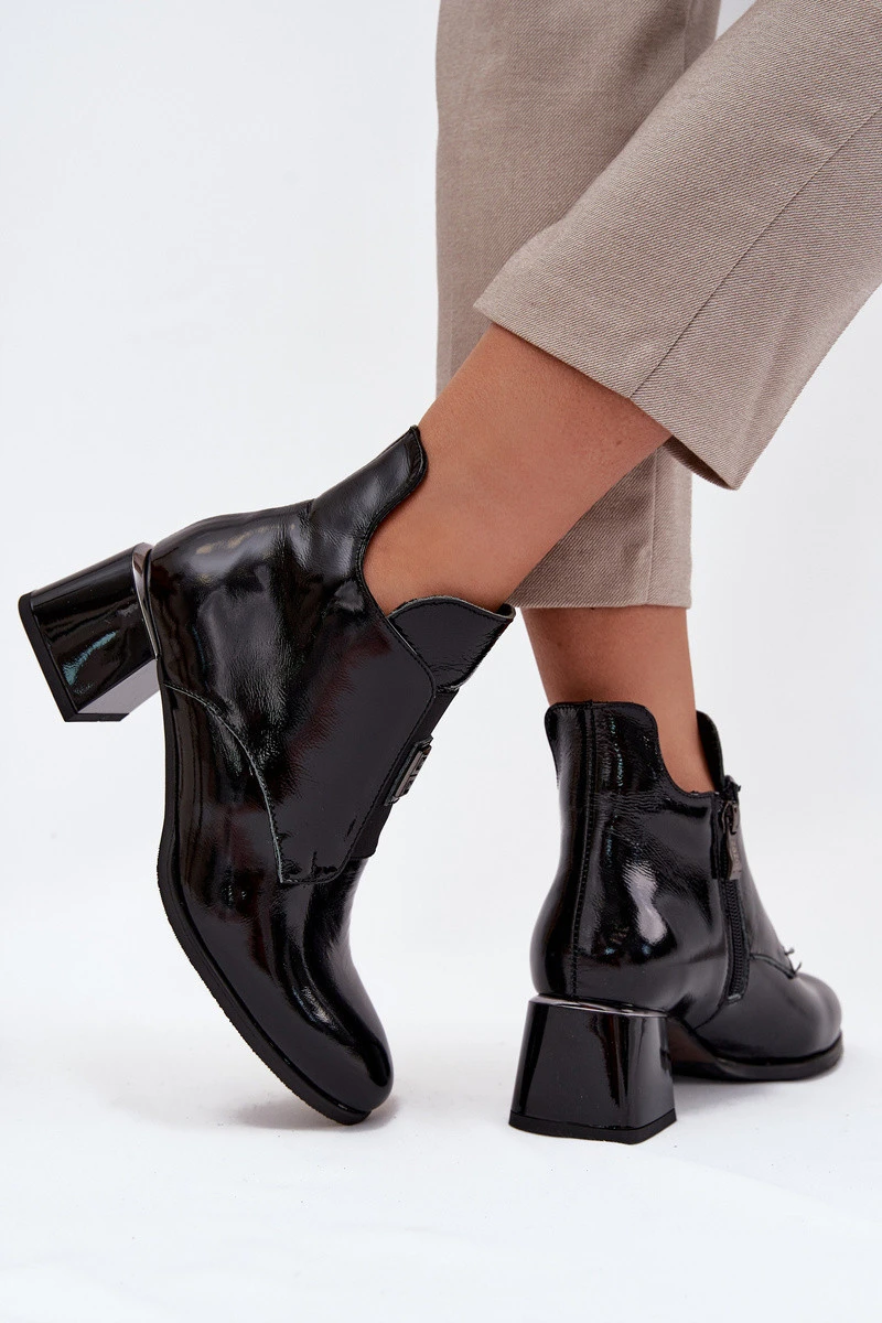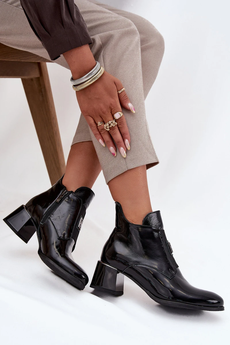 Kožené lakované kotníkové boty na klocku s ozdobným detailem zateplené Zazoo 60560 Černé