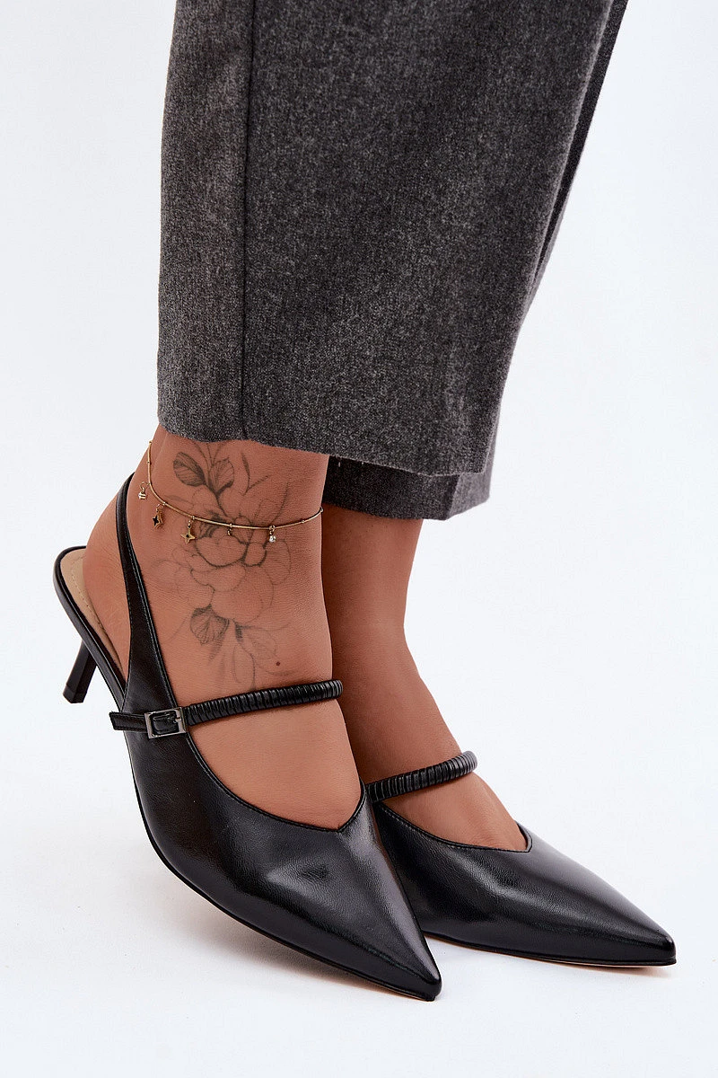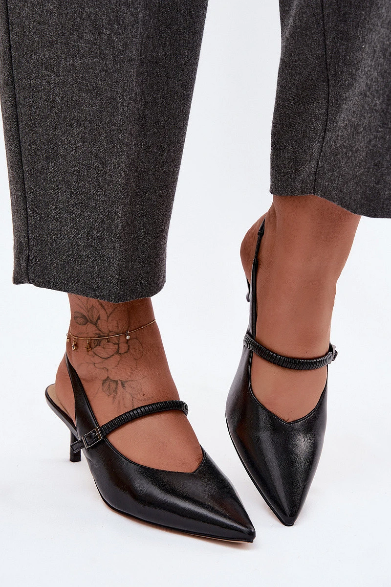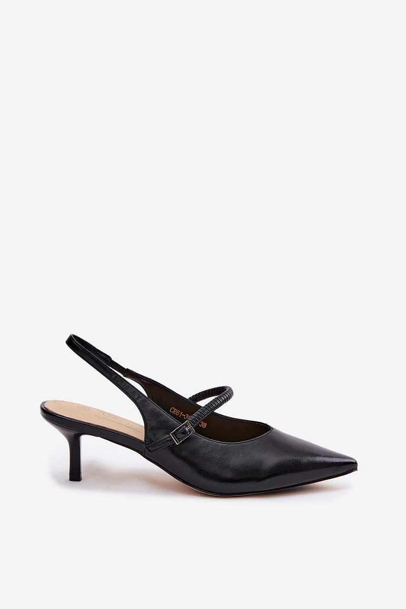Dámské lodičky s otevřenou patou z přírodní kůže jsou elegantní a nadčasovou volbou pro výjimečné příležitosti. Klasický střih s špičatými, zakrytými špičkami krásně zvýrazňuje linii nohy a dodává stylizacím ženský charakter. Tenký podpatek ve tvaru jehly opticky prodlužuje postavu, zatímco pásky na nártu s malou sponou tvoří decentní dekorativní prvek a pomáhají přizpůsobit obuv noze. Kožená vložka zvyšuje komfort nošení, takže model je vhodný jak na důležité události, tak na schůzky či večerní vycházky. Skvělá volba pro ženy, které ocení eleganci a pohodlí zároveň. Při výběru velikosti se řiďte tabulkou velikostí.
