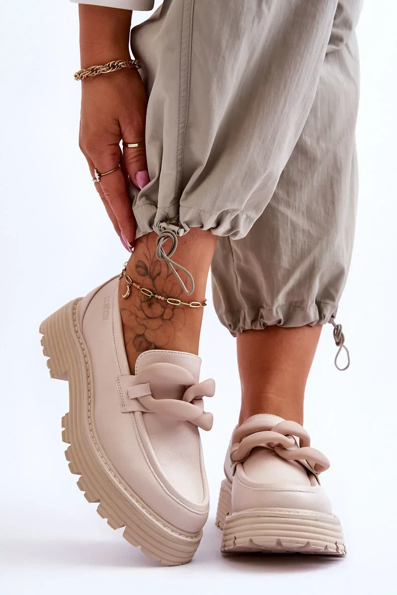 Módní boty - mokasíny jsou vyrobeny z ekologické kůže. Sada na platformě a plochých podpatcích. Mokasíny mají na přední straně ozdobný řetízek. Pohodlné používání obuvi zajistí stélka z ekokůže. Navíc je u těchto bot vyztužený podpatek. Při výběru velikosti se řiďte tabulkou velikostí.