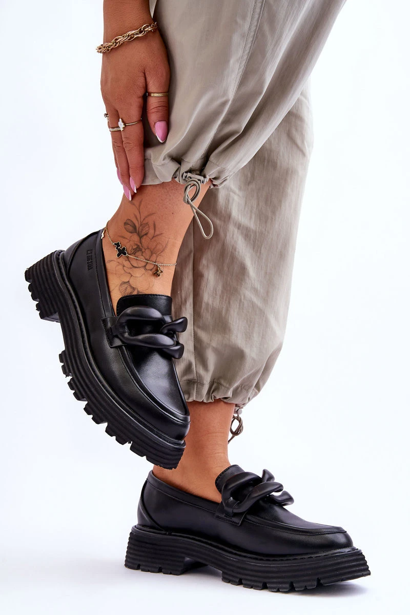 Módní boty - mokasíny jsou vyrobeny z ekologické kůže. Sada na platformě a plochých podpatcích. Mokasíny mají na přední straně ozdobný řetízek. Pohodlné používání obuvi zajistí stélka z ekokůže. Navíc je u těchto bot vyztužený podpatek. Při výběru velikosti se řiďte tabulkou velikostí.