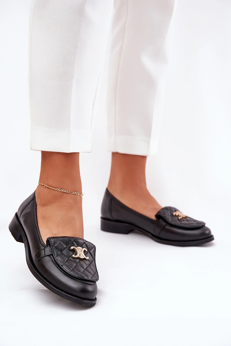Elegantní dámské mokasíny vyrobené z vysoce kvalitní přírodní kůže. Přední část bot zdobí jemné prošívání a zlatý prvek, který jim dodává šarm a výjimečný charakter. Zaoblené špičky dávají modelu klasický vzhled a kožená stélka zajišťuje pohodlí při nošení po celý den. Ideální jak pro každodenní, tak pro formálnější stylizace - nutnost v šatníku každé ženy! Při výběru velikosti se řiďte tabulkou velikostí.