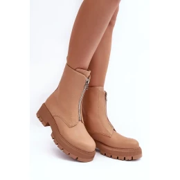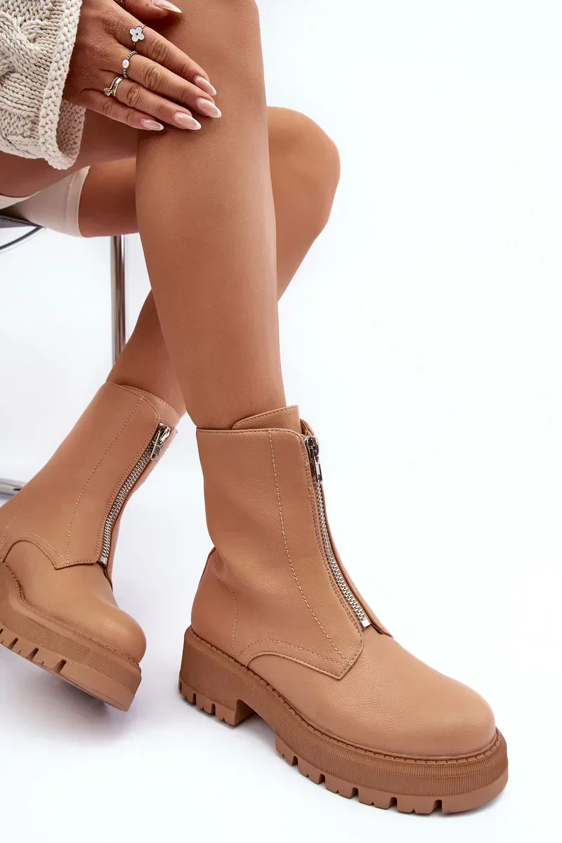 Moderní dámské boty vyrobené z ekologické kůže. Model s zaobleným špičkou. Osazené na plochém, stabilním podpatku a platformě. Zapíná se na zip vpředu. Vnitřek je izolován kožešinou. Špička tohoto obuvi je zesílená. Při výběru velikosti se řiďte tabulkou velikostí.