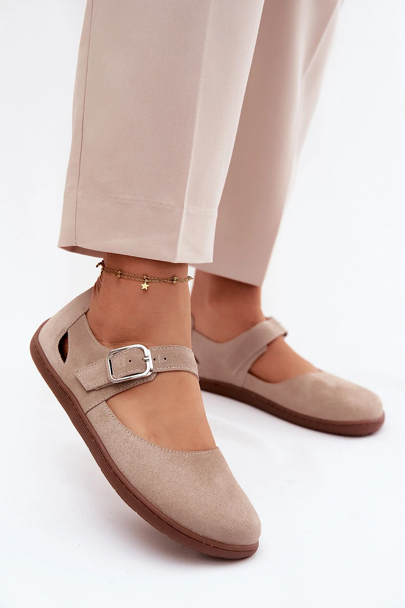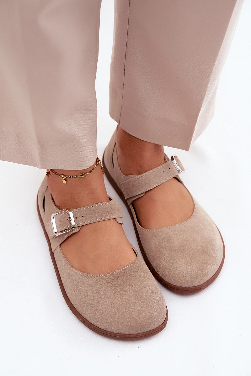 Kožené semišové baleríny Barefoot s páskem model 22125873 béžové - Zazoo