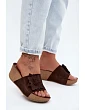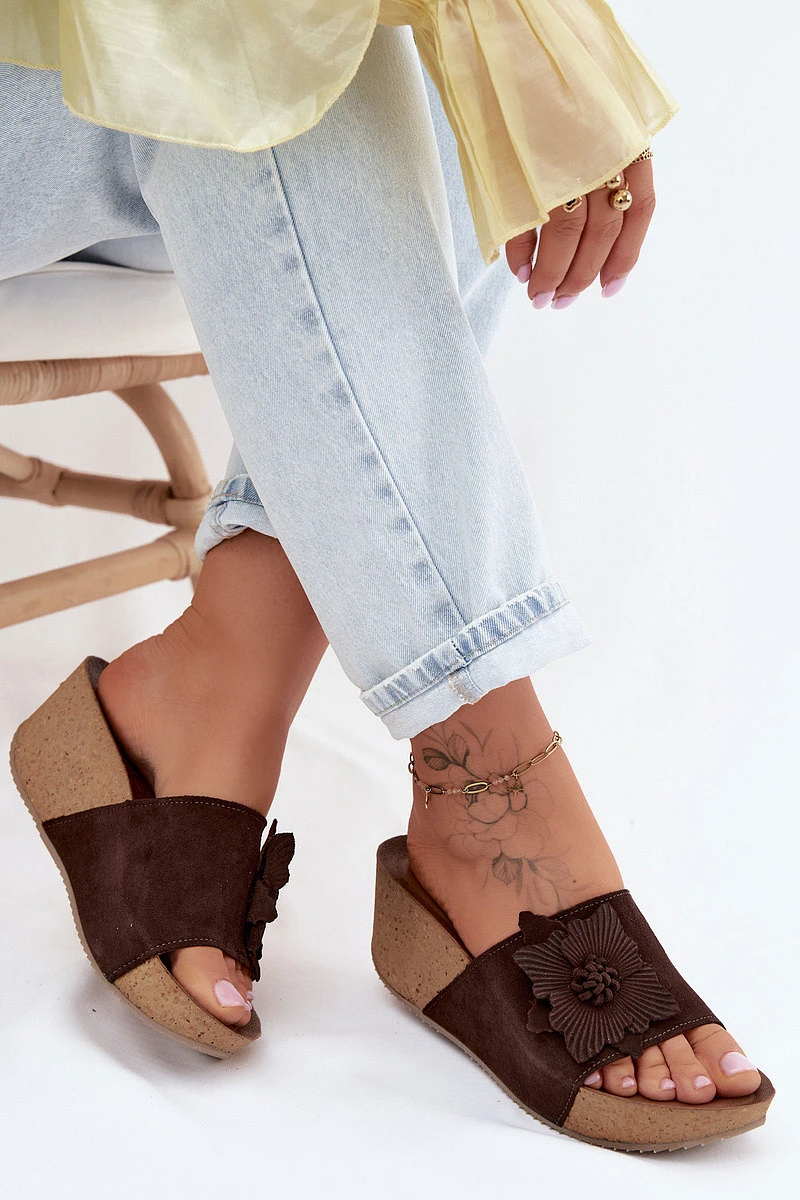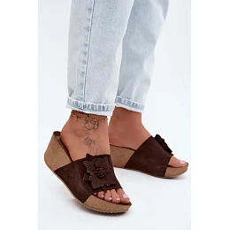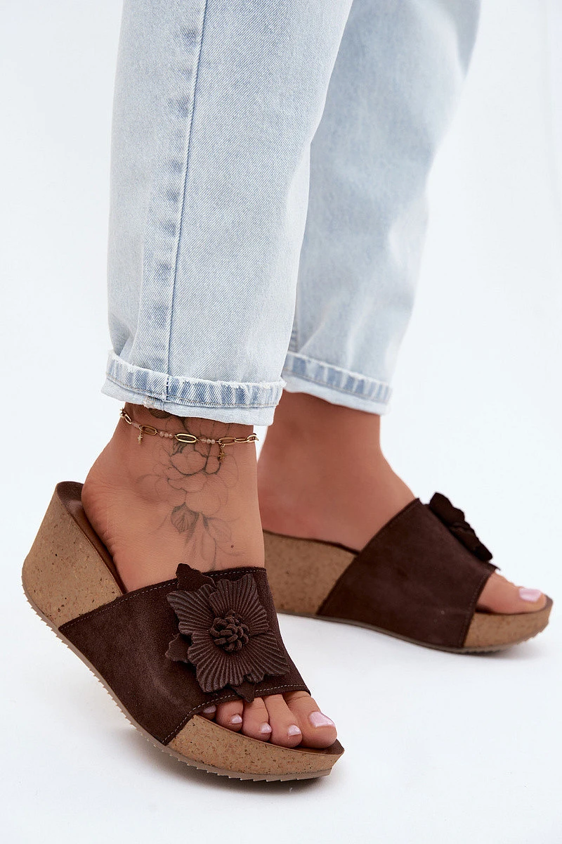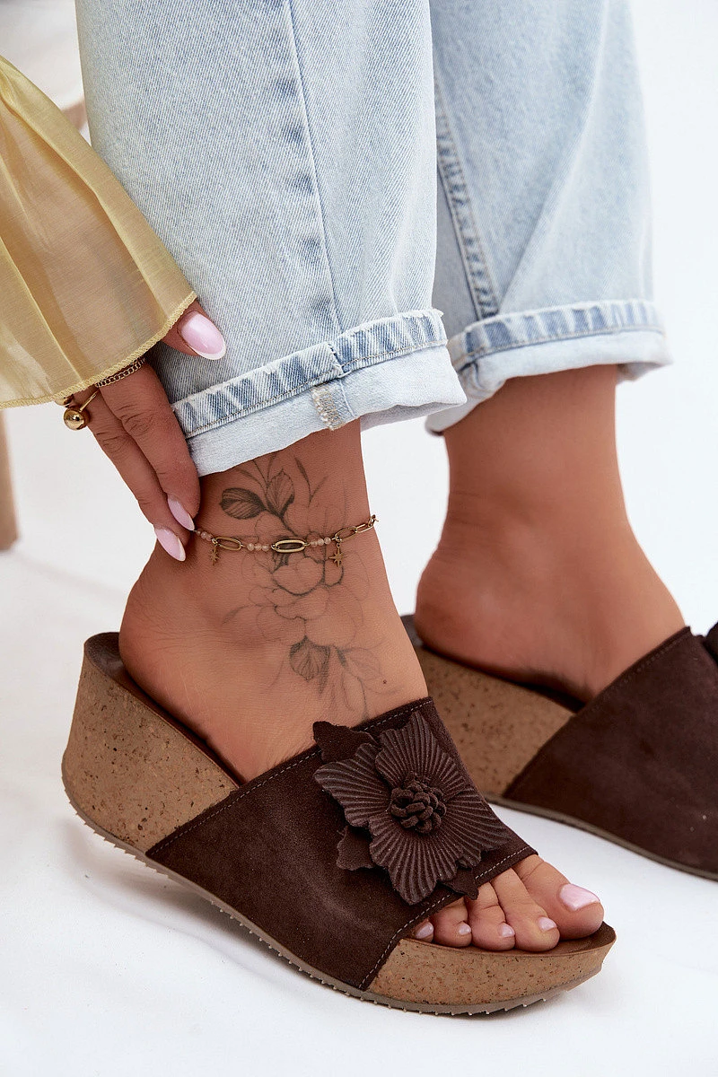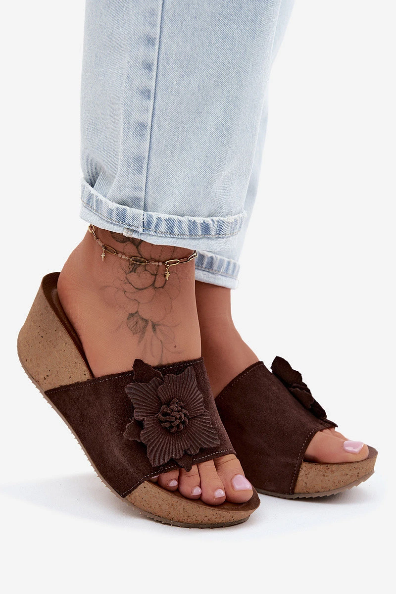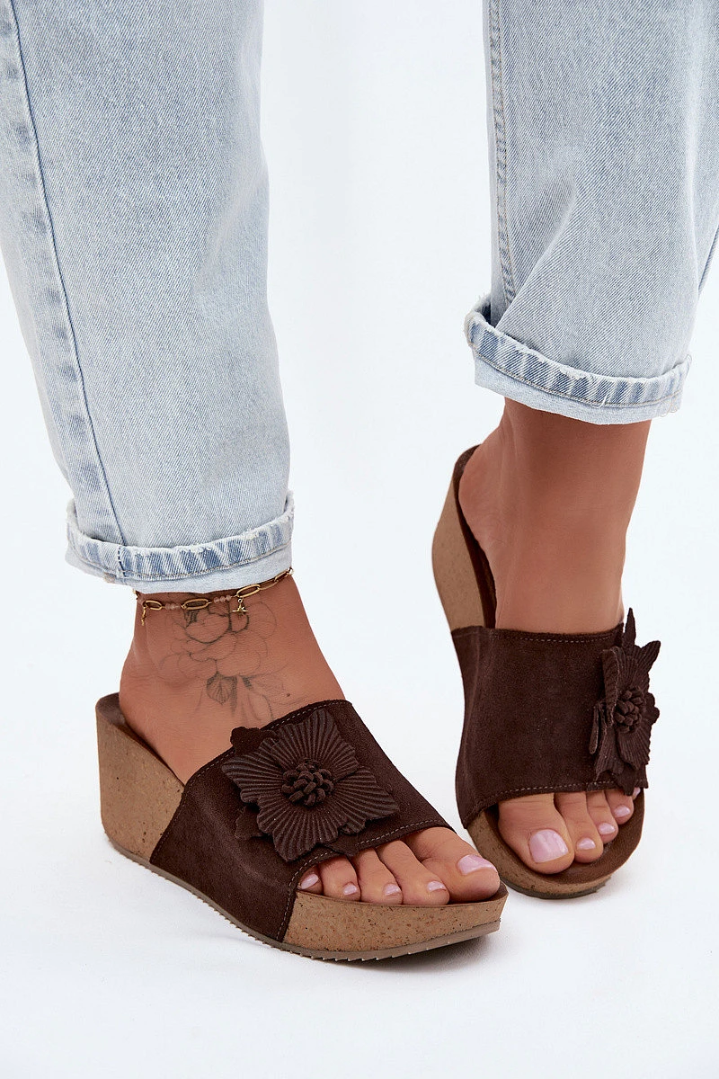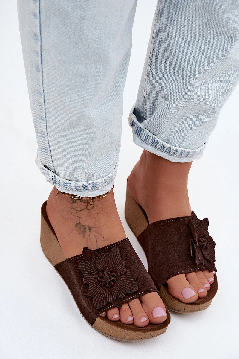 Kožené semišové dámské pantofle na platformě s ozdobným květinou Zazoo 40312 Hnědé