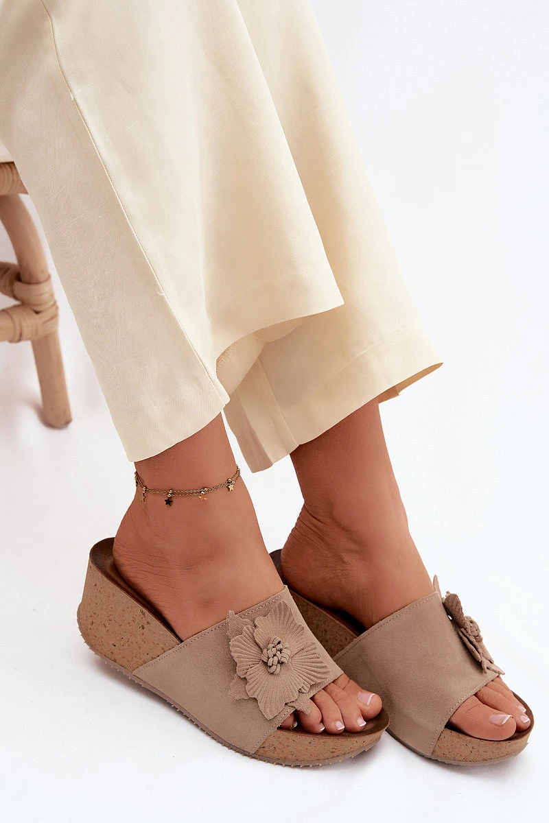 Kožené semišové dámské pantofle na platformě s ozdobným květinovým vzorem model 22125922 Cappuccino - Zazoo