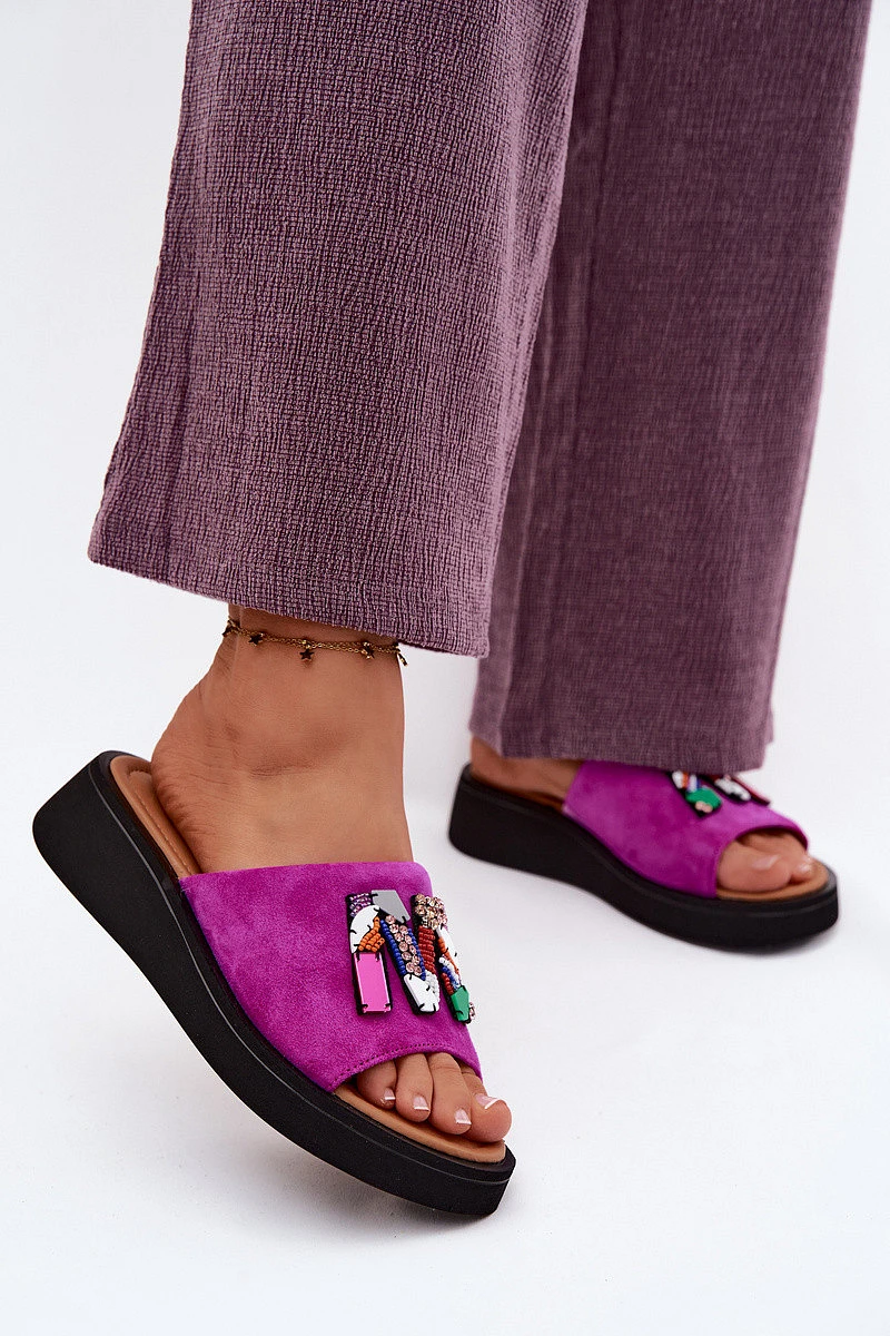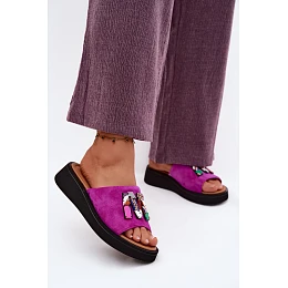 Kožené semišové dámské pantofle s ozdobou na platformě model 22125953 fuchsiové - VINCEZA